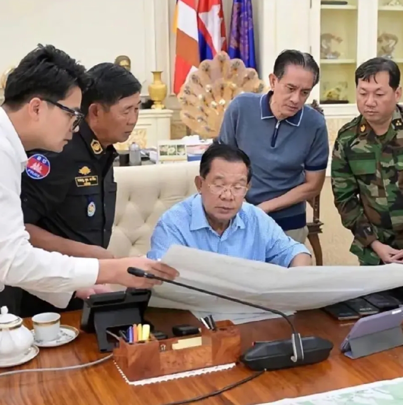 毕竟是见过世面的,洪森新照片还是一如既往地淡定。左手星巴克,右手功夫茶,身后大地图,前面显示屏。 一群人立着讨论,他就坐在带滑轮的椅上玩儿手机,脚上穿着皮拖鞋。 在洪森前面摆着的带显示屏的电话,我得有十来年没见过了。 自从有了手机,这种带线的固定电话在咱们这边已经慢慢被淘汰了。 而且偌大的办公桌找不到一台笔记本电脑,大家都是用笔在本子上写啊画的。 洪森表情严肃,手腕上戴着杰克宝与布加迪的联名款腕表,懂行的说这表二手货也得在100多万。 到今年8月,洪森就满73岁。放大照片可以看见他脸上有很多色斑,耳垂折痕也很明显。 这个岁数一般人都踏踏实实养老了,但洪森明显不是一般人。