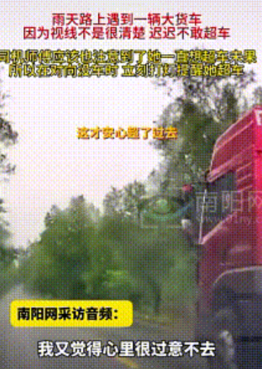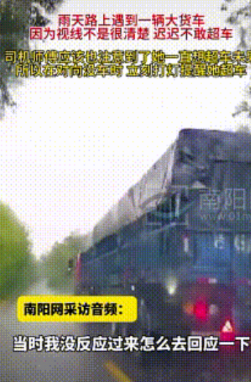 大货车司机注意到了郭女士,等到对向没有车辆的时候,打开了右转向灯。郭女士也是头一次遇到这种情况,凭着自己8年的开车经验,意识到这是货车司机在提醒她可以超车。