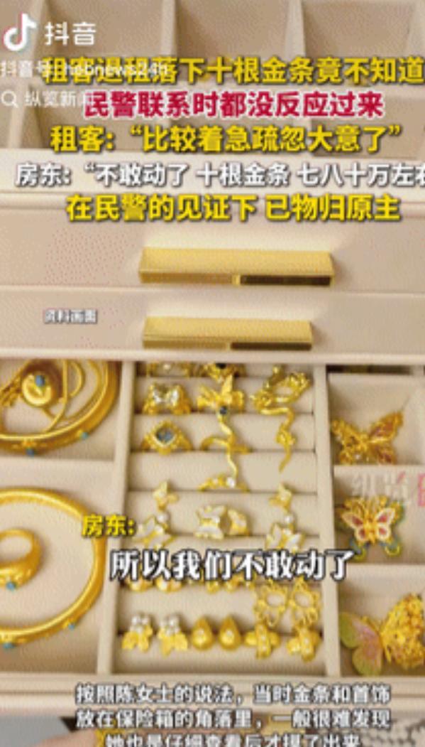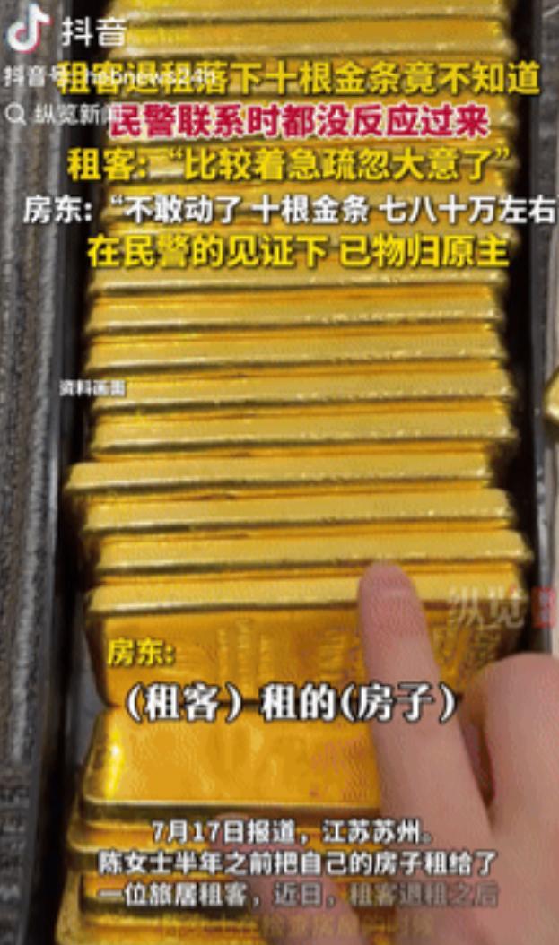 “心真大!”江苏苏州,一女子检查租客退租后的房屋时,意外发现屋内藏有10根金条,