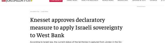 当地时间7月23日,经过长时间的讨论,以色列议会以71票赞成、13票反对的巨大优势,通过了一项宣言决议,支持“将以色列主权应用于犹地亚、撒马利亚和约旦河谷”。 按照以色列媒体的说法,此次投票被归类为“就以色列议会决定列入议程的议题进行的辩论”,不会产生任何操作或立法后果。 但此举,实质上已经迈出了对约旦河西岸“事实吞并”的关键一步了,至少改变了以往对这些地区“临时军事占领”的说辞。 这样一来的话,约旦河西岸的“巴勒斯坦权力机构”——法塔赫,实际上已经名存实亡了,现在巴勒斯坦境内唯一不被以色列控制的、且有自主权的权力机构,就是目前在加沙战斗的哈马斯了。