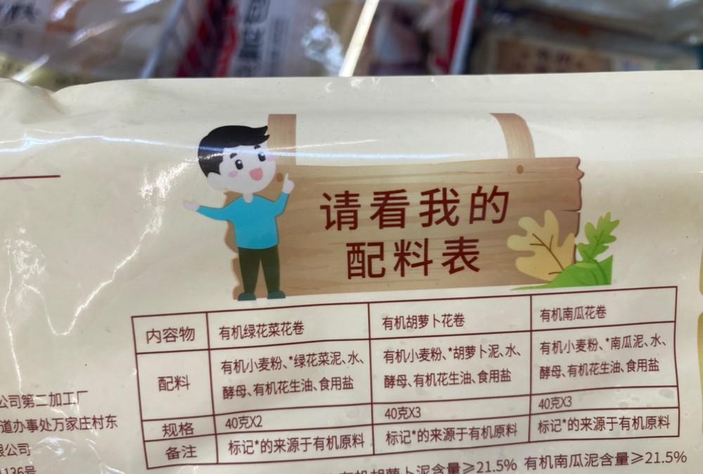 预制食品有什么不好? 这种儿童花卷有三个颜色和味道,其一是有机绿花菜花卷,配料是有机小麦粉、绿花菜泥;其二是有机胡萝卜花卷,配料是有机小麦粉、胡萝卜泥;其三有机南瓜花卷,配料是有机小麦粉、南瓜泥。看吧,吃的明明白白不好吗?干嘛非要吃那所谓纯手工食品呢?厨子会告诉你饭菜里放了什么东西吗? 所以别迷信那些所谓纯手工制作的食品了,预制食品最起码吃的明明白白!尤其是给孩子的饭食更要吃的明白!