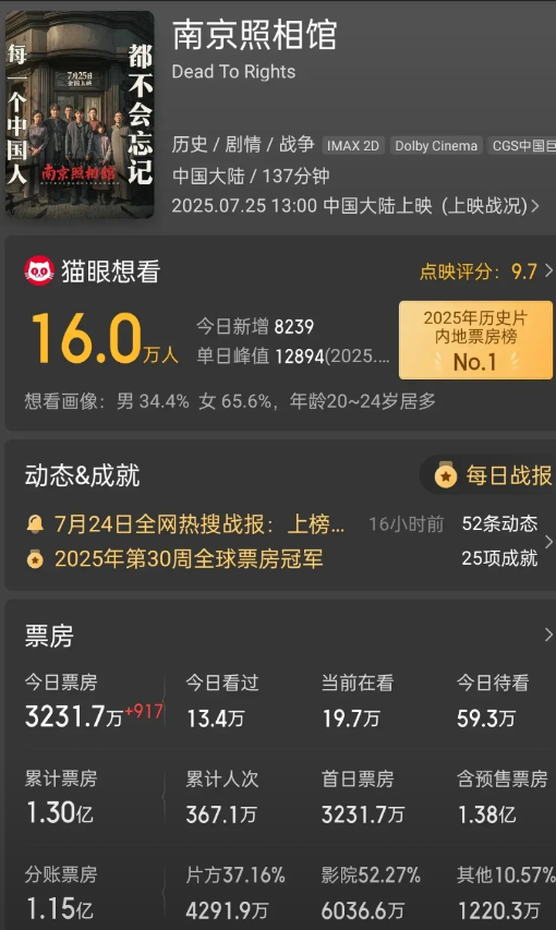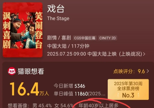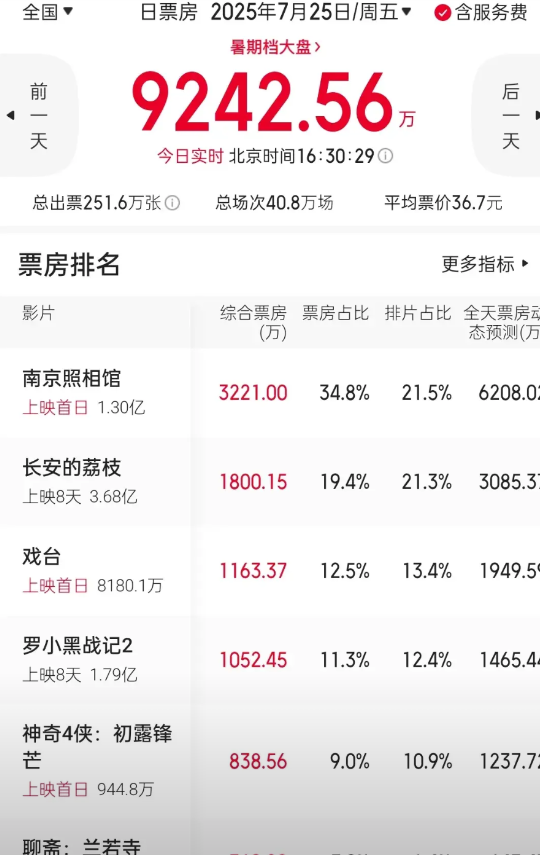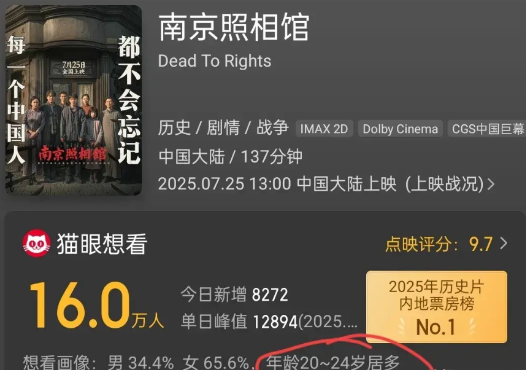 终于知道《戏台》为啥被《南京照相馆》碾压了。 今天是《南京照相馆》和《戏台》的首映日,截止截屏时票房情况如下: 《戏台》当日票房1163万,总票房8180万。 《南京照相馆》当日票房3221万,总票房1.3亿。 这个票房差距还是挺明显的。 一边是陈佩斯带着黄渤、姜武,一边是申奥携刘昊然、王传君、高叶、王骁,阵容上不相上下,差在哪里呢? 个人感觉主要有两点: 一是题材上,《南京照相馆》取材于南京大屠杀期间日军真实罪证影像,非常适合暑期带着孩子一起看。 二是受众群体,《南京照相馆》的想看人群是20到24岁居多,而《戏台》是40岁以上居多,前者在影院的消费能力远远大于后者。 如今《戏台》预计票房3.65亿,《南京照相馆》预计票房12.18亿,感觉还是比较符合现实的。