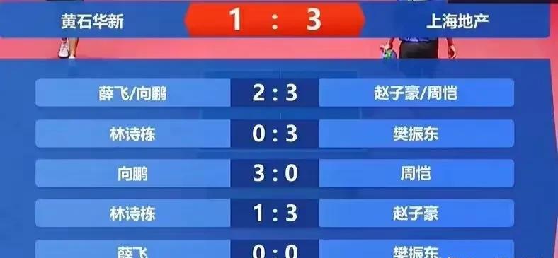 林诗栋今天看来有点“不宜比赛”,在乒超联赛第二阶段代表黄石基地对阵上海地产集团的比赛中,作为一号主力的他,在第二场和第四场出战,先后以0-3和1-3输给樊振东和赵子豪,丢掉两分,直接让队伍1-3失利。