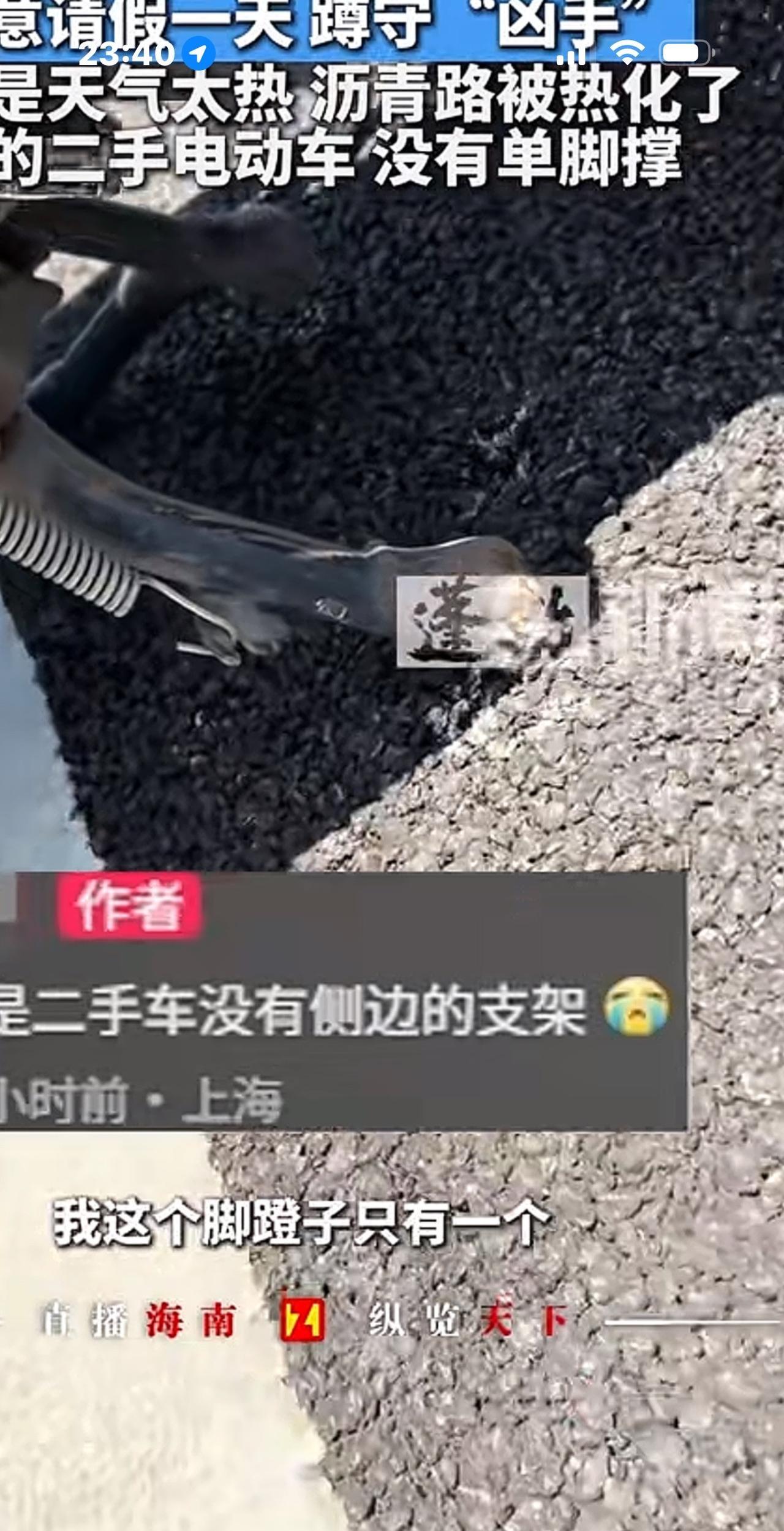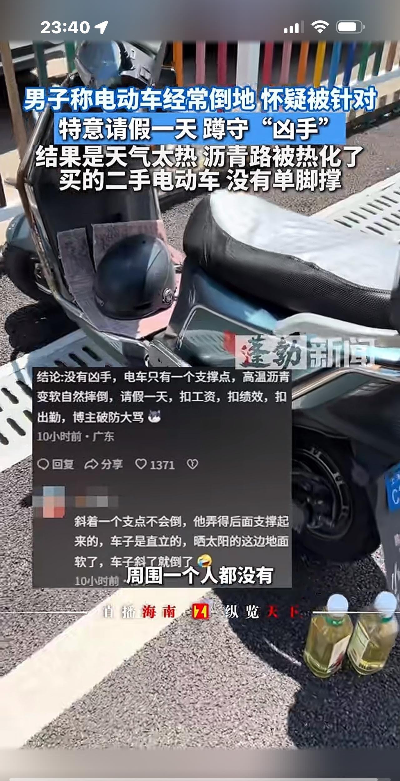 离奇!上海,这哥们的电动车,每天停在外面就莫名其妙被人推倒,就跟他那一辆车过不去,人家一排排的都没事。 哥们纳闷不已,心里那个难受啊:“ wo cao,为啥只针对我呢?” 于是,他突发奇想,请一天假,专门蹲守,看到底是什么坏人来掀倒他的电动车,偷偷作案的,他一定要把这个仇人给抓起来。 烈日当空,这哥们蹲在车场汗流浃背,被晒得晕头转向,他守了半天,也没见一个人来动他的车,正当他失望透顶,动摇着要不要撤离的时候,突然有了新发现! 是的,大概下午2点多钟,日照最强烈、达到顶点之后,这哥们热得快中暑的时候“破案”了! 原来,推倒电动车的不是别人,而是这几天上海温度太高,太阳像个大火球,高高悬挂在天空,阳光太毒辣,把地面的黑色沥青烤软、变形了,电动车就“砰”的一声倒地了。 因为这哥们的电动车是二手的,买来的时候, 侧边就只有一个支架,停在外面的时候,被晒化的沥青路就压出了一个坑,支撑不是很稳,所以车子就倒了。 这哥们儿后悔不迭,找了半天,一个人也没有,“凶手”原来是半空悬挂的太阳,和黑色沥青联盟“作案”,他找谁说理去?反而是自己请一天假,被扣工资、扣绩效、扣出勤,亏大了,哈哈哈哈…… [笑哭][笑哭]