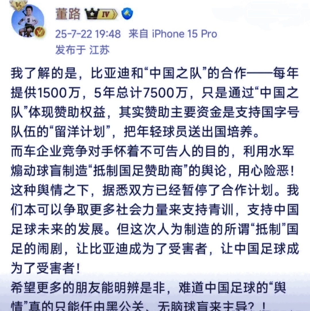 最近网上传出比亚迪和国足进行合作,前者计划赞助后者7500万元,虽然比亚迪没有公开回应,但这个消息是多家权威媒体报道,真实性比较高,正因如此车圈直接炸锅,byd确实受到一定影响。就在刚刚,拥有接近2000万粉丝的足球圈大佬董路发文说由于车企竞争对手怀着不可告人的目的,利用水军制造抵制国足赞助商的舆论,据了解比亚迪和国足已经暂停了合作计划。