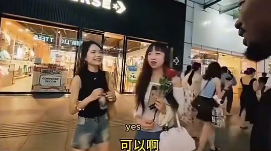 他向两名中国女孩献花搭讪,夸女孩子很漂亮问她们有没有男朋友,女孩说没没!