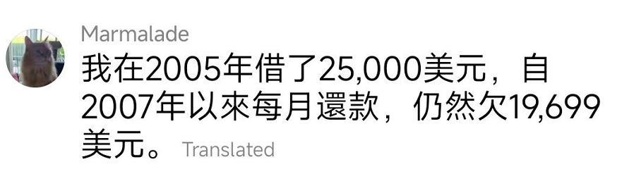我一直知道美国的学生贷款是一个巨大的陷阱,没想到,具体竟然是这么狠,比抢劫还狠,简直可以说是吃人了。 刚看到一视频,Tik Tok上,一个美国人分享了他充满绝望的,还学生贷款的经历。这个人说,他的学生贷款总共是30152美元,从大学毕业开始,没有断贷,连续还了13年,结果,他现在发现,他的学生贷款依然欠款30152美元,这让他非常绝望。 离谱的是,这样的事并不是孤例,评论区也有其他美国网友附和,说他在2005年借了2.5万美元的学生贷款,从2007年开始,一直每月还款,到现在,他还欠银行19699美元。 这种现身说法,听起来真的像吃人,太恐怖太绝望了。不知道这贷款是怎么计算的,怎么利滚利的?根本还不清,感觉跟老美的学生贷款相比,封建社会的九出十三归,可能都算是文明世界的玩法了。
