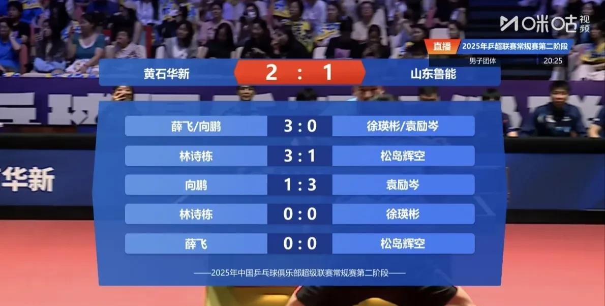 林诗栋独得两分,带领黄石华新取胜山东鲁能! 今晚,中国乒超联赛第二阶段
