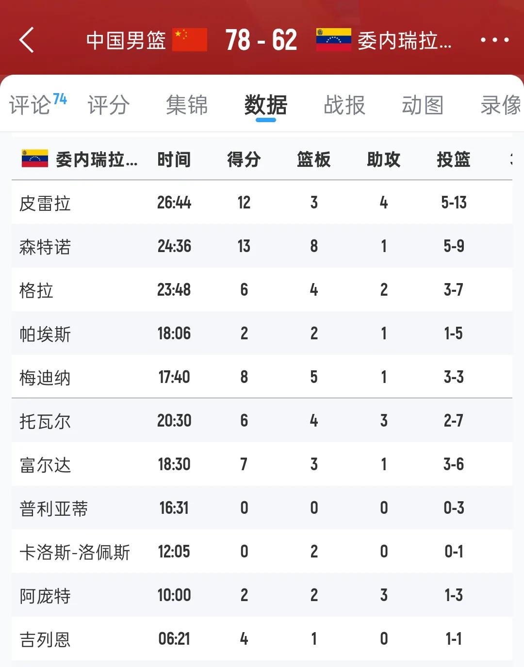 与委内瑞拉两场热身赛结束了, 第一场中国77:49 第二场中国78:62 都获胜