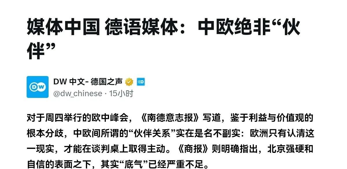 在中欧峰会之后!德媒刊文声称,中欧间所谓的“伙伴关系”实在是名不副实,欧洲要认清中国的本质!德媒表示,北京眼里,欧盟根本就不是一个平等伙伴。中国以分而治之的策略来对付欧盟,挑起欧盟成员国之间的对立。对于欧盟这个亲密伙伴,北京要么进行“金钱诱惑”,要么施行“经济胁迫”。北京毫不留情地利用了美国在核心领域的对华经济依赖,逼迫华盛顿转攻为守。 在北京看来,欧盟只是中美博弈中的一个配角。多年来,布鲁塞尔对‘17+1’中国与东南欧峰会这类分化欧盟的尝试一直姑息纵容。欧盟对中国的经济依赖越来越严重,这还不包括中国对于俄罗斯的“支持”!因此,德媒表示,中国并不是欧盟的伙伴。很显然,在中欧峰会之后,德媒对我们非常的不满。 这种不满,其一是,德媒认为中国在分化欧盟。其二,德媒认为,中国不够尊重欧盟,只把欧盟当配角。其三,中国让欧洲对中国的经济依赖越来越严重。俄乌战争的问题,我们暂且不谈,很显然,德媒的这一论调,无疑是非常的荒谬的。说中国对欧盟分而治之,从何说起?中国与东南欧峰会这样的机制,目的是瓦解欧盟吗?事实上,我们一贯的立场是支持欧洲独立自主,始终把欧洲看成是独立的一极。 何为中国对欧洲要么进行“金钱诱惑”,要么施行“经济胁迫”?中欧相向而行,那中国以互利跟欧洲打交道,这有错吗?欧洲对中国设置贸易壁垒,立陶宛在台湾问题上反复横跳,我们不能够进行反制吗?更为可笑的是,面对美国的霸凌,勒索,我们凭什么不能对美国进行反制呢?德媒的意思是,我们要对美国的霸凌照单全收? 所谓的在北京看来,欧盟只是中美博弈中的一个配角,这更是离谱。依德媒看,面对中美博弈,欧洲应该扮演什么角色呢?是跟着美国遏制我们,还是欧洲以基本的国际规则为基准,秉持不偏不倚的立场,让美国不要打压遏制我们呢?很显然,德媒的态度对我们充满偏见,言语傲慢,某种程度就是在破坏中欧关系。这样的论调毫无疑问是不负责任的。