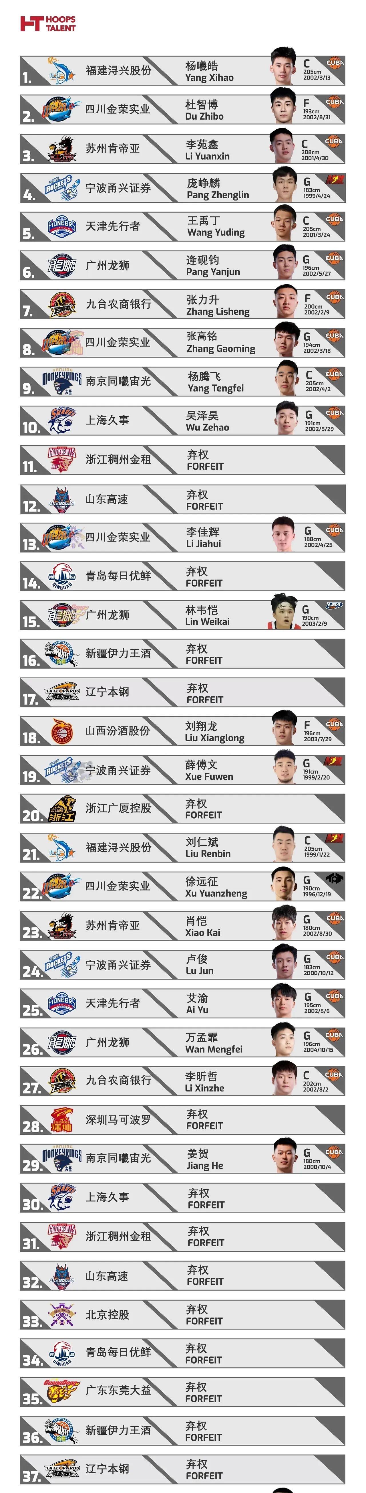 四川、宁波、广州扫购选秀首轮签位, 福建包揽清北双塔+宝岛妖卫梦碎! 今天公布的各支球队签位易手情况: 之前有传言福建队有意打包清华北大内线双塔,询价四川签位被要价邹阳,直接蔫了。 从目前签位来看,如果福建状元选择杨曦皓,李苑鑫基本不会掉出前五,湾湾后卫林韦恺选情一路看涨,估计也会在前十签位被选中。 今年首轮的竞争激烈程度远大于以往各届,次轮基本无漏可捡,所以福建的次轮基本无人可选。#福建男篮# #首轮选秀球员# #CBA选秀大会# #四川男篮# #广州龙狮# #宁波男篮# #江苏男篮#