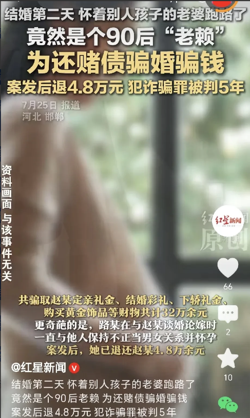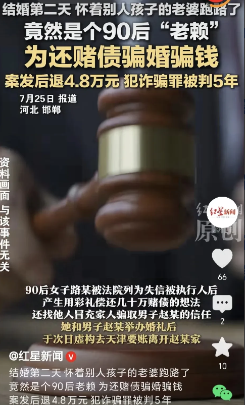 河北邯郸,一90后女子是老赖,为还赌债,假装和男子谈恋爱,她找人冒充自己家人,索要礼金,在这期间,她还和和别人交往,成功怀上了别人孩子,男子不知被骗,带着绿油油的帽子,依旧和她举办婚礼,订亲礼,结婚礼,下轿礼,还有黄金饰品,一共给她32万,万万没有想到,结婚第2天,女子拿着钱跑了,男子告到法院,法院这样判了!