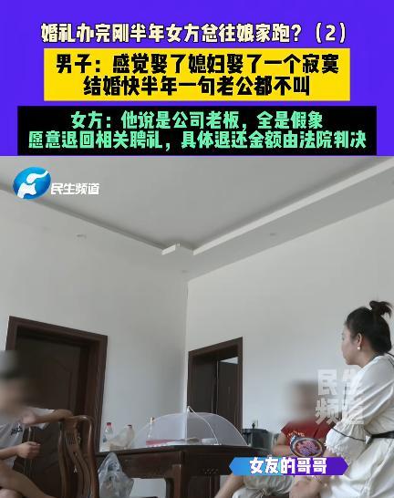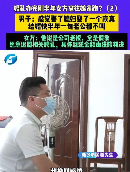 河南新乡,一男子经人介绍,和一女子结婚,两人摆了酒席,没领结婚证,结婚半年,女子一句老公没喊过,让男子出去挣钱,分她一半,还总往娘家跑。男子气坏了:要是不想跟我好好过,就把十万一的定亲礼金和128000元的彩礼,还有五金退给我。可女子却说:他对所有人说他很有钱,是老板,我以为他账户里有200多万,结果全是假象。女方家说的隐情,让人出乎意料。 据极目新闻7月21日报道,魏先生(化名)和张女士(化名),经媒人介绍相识。媒人搭桥时,或许带着美化与期待,让两人对彼此有了最初的印象。魏先生渴望一段温暖的婚姻,张女士也盼着能与靠谱的人相守,于是,在相识后,没过多久他们俩就携手步入婚姻殿堂。 婚后的生活,却逐渐偏离了魏先生的期待。半年时光里,妻子没叫过他一声 “老公” 。这声简单的称呼,在婚姻里本是爱意与亲密的体现,可魏先生始终没能听到。不仅如此,妻子频繁往娘家跑,留他独自面对生活。 后来,妻子让魏先生独自去北京挣钱,还提出挣的钱要分她一半,仿佛是一场带着条件的合作,不是自己想象中的婚姻,而张女士只有她心情好时才会考虑回来,把婚姻当成了一场可以讨价还价的交易。这让魏先生陷入更深的孤独与无奈,满心期待的婚后生活,成了漫长的寂寞等待。 而在张女士眼中,这段婚姻同样满是失望。她曾和魏先生一起去过北京,本想着夫妻携手奋斗,可过程中发生的事,让她委屈到哭着回来。更关键的是,魏先生关于公司老板的说法,成了导火索。 张女士一开始以为自己嫁的是有事业并且有担当的人,最后却发现并非如此。她觉得是魏先生先欺骗了自己,这份欺骗,击碎了她对婚姻的信任,让她对这段关系彻底寒心,于是选择回到娘家,用距离表达自己的不满与失望。 魏先生这边,对于公司老板一事,也有自己的解释。他承认现在不是老板,但强调之前确实是一家公司的法人。他说不是有意欺骗,是媒人介绍时弄混淆了信息。或许最初,媒人想要促成这段姻缘,放大甚至弄错了他的身份信息,可这一个误会,在婚姻里掀起了巨大的波澜。 魏先生没料到,这么一个身份的问题,会让妻子对自己的信任崩塌,也让原本就摇摇欲坠的婚姻,变得更加岌岌可危。随着矛盾升级,两人的婚姻走到了难堪的境地。 张女士提出愿意退回相关聘礼,具体退还金额交由法院判决,要用这种方式,给这段满是疮痍的婚姻做一个了断。曾经带着期待走进婚姻的两个人,如今要对簿公堂,用法律的途径,去清算这段婚姻里的得与失。 婚姻里的沟通和理解太关键,要是双方能早点把这些矛盾摊开说,把心里的委屈、不满讲清楚,或许不至于走到这一步。 对于这件事,大家有什么想说的呢?欢迎在评论区分享。 信息来源:极目新闻 报道于2025年7月21日