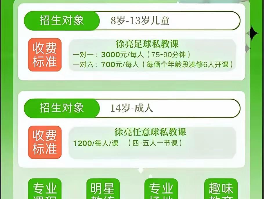 用雄厚的财力堆出来的主力球员,他们不配进国家队,他们只是捞钱的工具… 徐亮那句再降薪就没人踢了,一点毛病没有!再降薪他的天价私教课就没有学生了,谁会花几百万学习踢足球,最后在联赛里挣几十万薪水呢? 我免费给徐亮私教课打个广告: 徐亮私教课(8-13岁年龄段)一对一教学一节课3000元,一对六教学一节课700元。14岁-成人,一节课每人1200元! 这种昂贵的天价私教课,百分之百的筛选掉了没有经济实力却极具天赋的孩子! 所以,大家继续吧,不要停!不把他们打下去,足球没好!