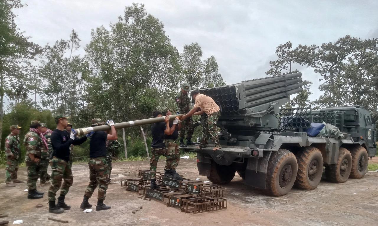 柬埔寨士兵正在为其PHL-90多管火箭发射系统准备SHE-40型122毫米火箭弹