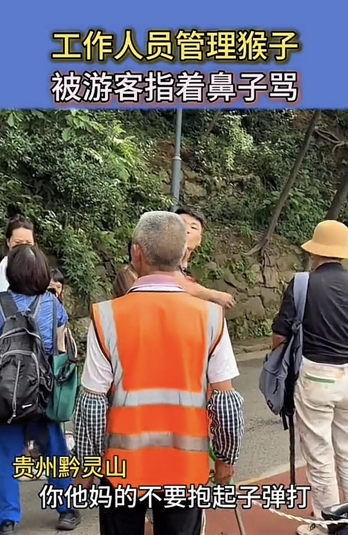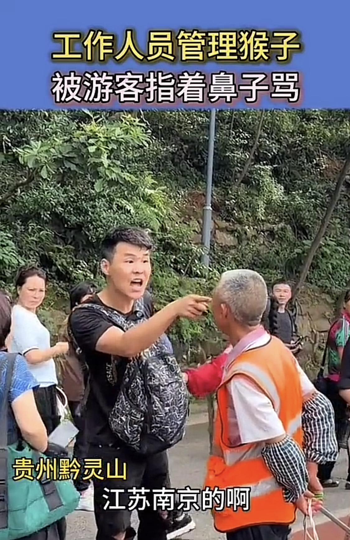 从1600公里以外的南京来看猴子,应该是动物爱好者,年轻人爱护猴子心切,管理人员对国家二级动物的驱赶和管理方式也是不妥的。 本来是一件很小的事,年轻人可以心平气和的交流,稍微控制一下自己的情绪,不能张口就骂这位工作人员,还用手指着骂,这是不对的,这位工作人员的年龄和他父母岁数应该差不多,实在不应该这样对待工作人员。