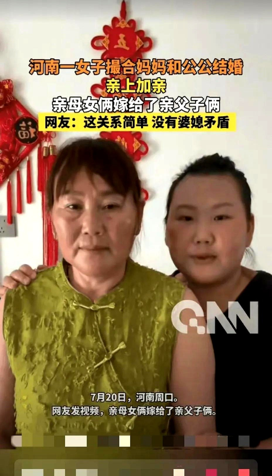 “彻底乱套了!”7月20日,河南周口一女子结婚后,发现公公性格孤僻,竟将自己的母亲许配给公公,母女俩嫁给了父子俩,四人组建了一个新家庭。网友调侃:“这关系简单,没有婆媳矛盾”。