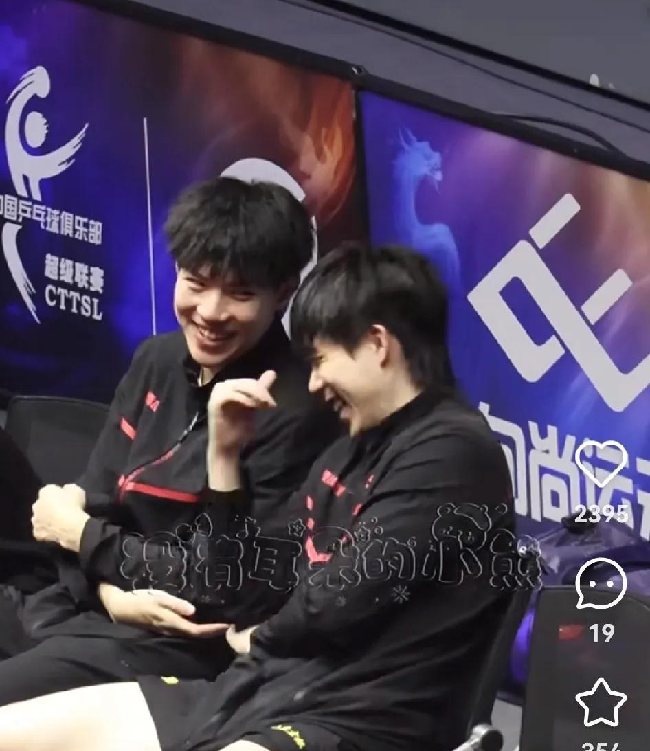 京队少爷2.0版和3.0版, 两个人这是聊了啥, 笑出了美丽的褶子! 不得不说, 谁跟王楚钦在一起, 都容易被感染开心, 不善言语的魏桥队员, 甜甜,台林,黄油, 哪一个都是采访没话, 到了王楚钦跟前, 都变得能说梦笑, 活脱脱i人变e人的节奏! 今天王楚钦和黄友政, 不知悄悄聊了啥, 王楚钦笑到满脸开花, 用手拍着黄油的大腿, 整的满脸大花鞋, 谁看了都跟着笑, 哥的笑点真的有点低唉! 你问谁是京队少爷1.0版? 我悄悄告诉你:马龙! #我的宝藏兴趣#