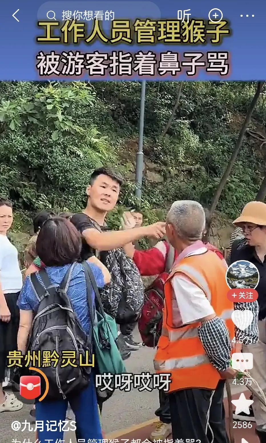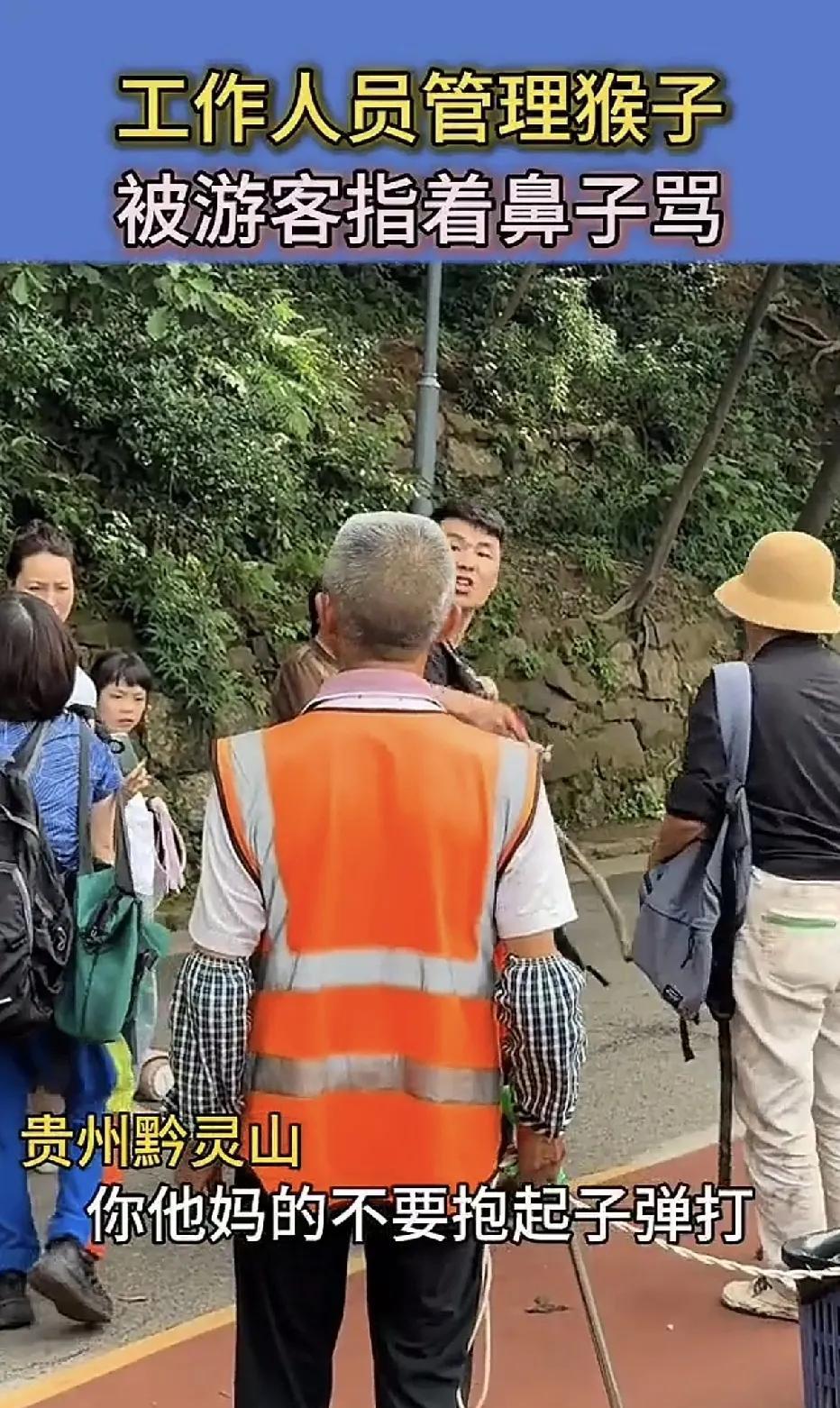 贵州黔灵山,这是猴子搬来的救兵?真是太狂野了! 黔灵山景区的猴子虽多,但也给不少的游客游玩经过,造成了拦路抢劫的风险。 工作人员也是出于对游客保护负责的责任心,拿起了弹弓去驱赶猴子。没想到却被江苏南京来的这位游客看到此情况,就动手叽叽歪歪对大爷说,你不能打猴子,再打我就打你,我就是专门过来看猴子的…… 瞧那个游客的激动样,说是猴子的亲兵都不为过,样貌长得像猴子一样,龇牙咧嘴的,都怀疑是从动物园要出来的。