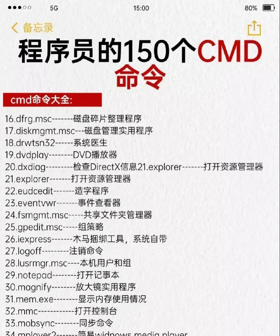 厉害了!这位985电脑高手竟然将电脑神级指令和CMD命令无保留整理出来了!没事让孩子把它倒背如流了,也能成为电脑高手,实现黑客梦!你会发现,原来打好电脑的基础会如此简单高效! 8个电脑神级指令包括定时关机、深度清理垃圾文件、远程控制他人电脑、查看电脑配置信息、虚拟键盘、查看使用记录、清理C盘缓存垃圾和关闭卡死的软件,这些指令都可以通过按下[Win+R]打开运行对话框,输入相应命令来实现。 而程序员的CMD命令则需要先通过开始-运行(或快捷键win+R)输入cmd进入命令行界面,然后再输入具体命令,如calc启动计算器、certmgr.msc用于证书管理等。 这些电脑指令和CMD命令对于提高电脑操作效率和解决一些常见问题非常有帮助。比如定时关机指令可以让我们在离开电脑时无需担心忘记关机,深度清理垃圾文件和清理C盘缓存垃圾指令能够有效释放电脑存储空间,提升电脑运行速度; 远程控制他人电脑指令为远程协助和远程办公提供了便利;查看电脑配置信息指令在我们需要了解电脑硬件情况或验机时非常实用;虚拟键盘指令在键盘故障时能应急使用;查看使用记录指令可以保障电脑使用安全;关闭卡死的软件指令能快速解决软件故障问题,避免电脑重启。 对于程序员来说,CMD命令是工作中不可或缺的工具,熟练掌握这些命令可以提高开发效率和系统管理能力。 然而,这些指令和命令也存在一定的局限性。例如,远程控制他人电脑需要对方授权,否则可能涉及侵权问题;部分CMD命令具有一定的专业性,对于普通用户来说可能较难理解和掌握。 不夸张的说,这些指令和命令是Windows系统提供的底层操作接口,它们的存在为用户提供了更灵活和高效的操作方式。随着计算机技术的不断发展,虽然图形用户界面(GUI)越来越普及和易用,但这些底层指令和命令仍然具有重要的价值,尤其是在系统管理、故障排除和开发调试等方面。 此外,我们还可以从网络安全的角度来理解这些指令和命令。一些指令如果被不法分子利用,可能会对电脑安全造成威胁。因此,在使用这些指令和命令时,我们需要注意保护个人信息和电脑安全,避免在不安全的网络环境中随意使用。 所以说这些电脑指令和CMD命令是非常实用的工具,但我们需要在正确的场景下合理使用,同时不断学习和掌握更多的计算机知识,以更好地应对各种电脑操作和系统管理问题。 这份CMD指令库,不是让孩子成为“黑客攻击者”,而是帮他们建立“掌控技术”的自信。当孩子能用几行代码解决实际问题时,那种成就感会远超游戏通关。建议那些家里有学计算机的孩子,家长工作再忙也要抽出时间来保存收藏给孩子看一看学一学,趁着暑假之余,多练一练,熟能生巧,电脑出故障的时候用得上! Word Excel PPT三大办公应用入门到精通+视频教程 职场【XMY】