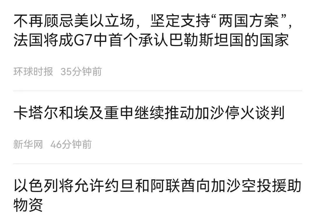 法国马克龙宣布将承认巴勒斯坦国。 财联社7月25日电,据CCTV国际时讯,当地时