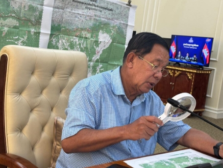 洪森背后的地图已经泄密了,可以发现,泰军(蓝色)控制着泰柬边境扁担山山脉,大部分制高点,有居高临下优势。柬埔寨军队(红色),很难佯攻,夺取这一线大部分制高点。