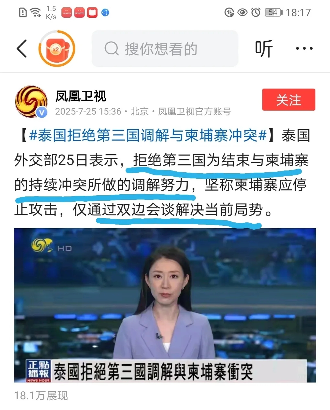泰国与柬埔寨的冲突再次揭示了强者一方的基本立场:拒绝第三方介入,这已成为强势国家解决冲突的普遍共识。尽管泰国在这场冲突中相对较小,但其军事和政治影响力使得这场冲突对柬埔寨来说,几乎就像狮子对羚羊,毫无压力。泰国的军事优势让其在冲突中占据了主导地位。 柬埔寨作为相对弱势的一方,迫切寻求第三方甚至多方的调解,希望能通过外部力量帮助缓解局势。然而,泰国坚决拒绝外部干预,主张通过两国之间的直接会谈来解决问题。这一立场显示出泰国对于自身主权和决策独立性的坚定立场,也体现了强者一方通常更倾向于通过直接对话而非外部介入来解决争端。 这种拒绝第三方介入的态度也反映了国际关系中的一种常见现象:强国往往更愿意掌控冲突解决的进程,而较弱的国家则希望借助外部力量寻求更多的保障和支持。在这种博弈中,柬埔寨可能不得不依赖自身的外交手段以及国际伙伴的支持,然而泰国则通过坚守自己不接受外部调解的立场,试图保持对局势的主导权。