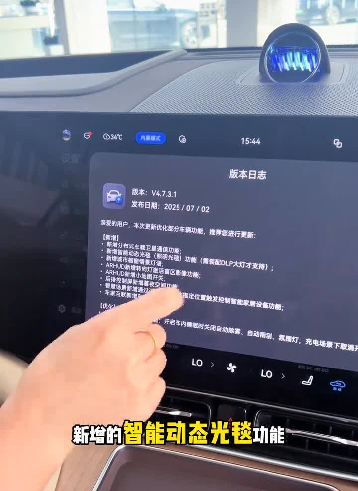 问界M9 OTA升级又可以体验新车了。 问界M9又OTA升级了,这次推送的是V4.7.3.1版本,今天就带大家看一下升级了哪些内容。 ·第一点就是情景灯语,新增了城市橱窗,选择到情景灯语里面可以看到里面丰富了非常多的内容,可以为自己的城市应援。以上海为例,可以看到后尾灯现在呈现的就是东方明珠的图案。 ·第二点AR HUD新增转向灯,激活盲区影像功能。当打转向灯的时候,不仅是在中控屏展示影像,在HUD上也是可以同步显示的。当然还新增了一个小地图的显示开关,开启后显示地图路线,辅助进行路口判断,当然也可以把它关闭掉。 ·第三点是大家最关心的,新增的智能动态光毯功能。只需要在车机上找到设置,找到灯光,车外灯光向下滑动,照明光毯打开就可以了。智能动态光毯自主开启,精准指引行车轨迹,光毯随光线车速、转向路况进行动态调节。 不愧是问界,就算是老款车型又怎么了?可以随时更新,还没有更新的老板去看看。