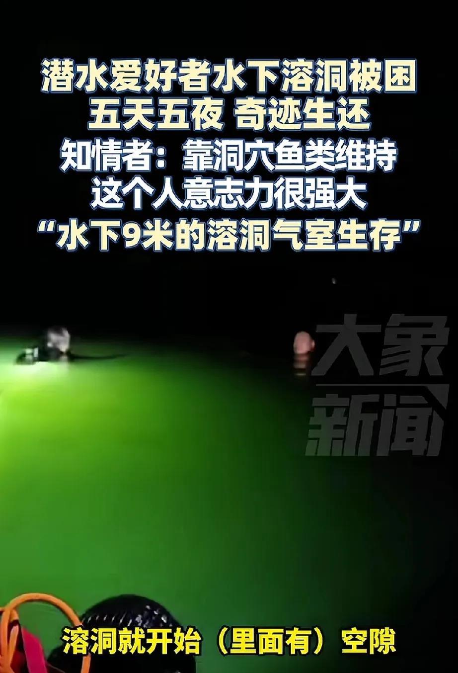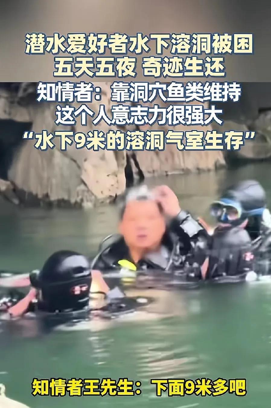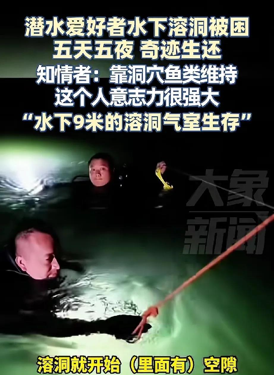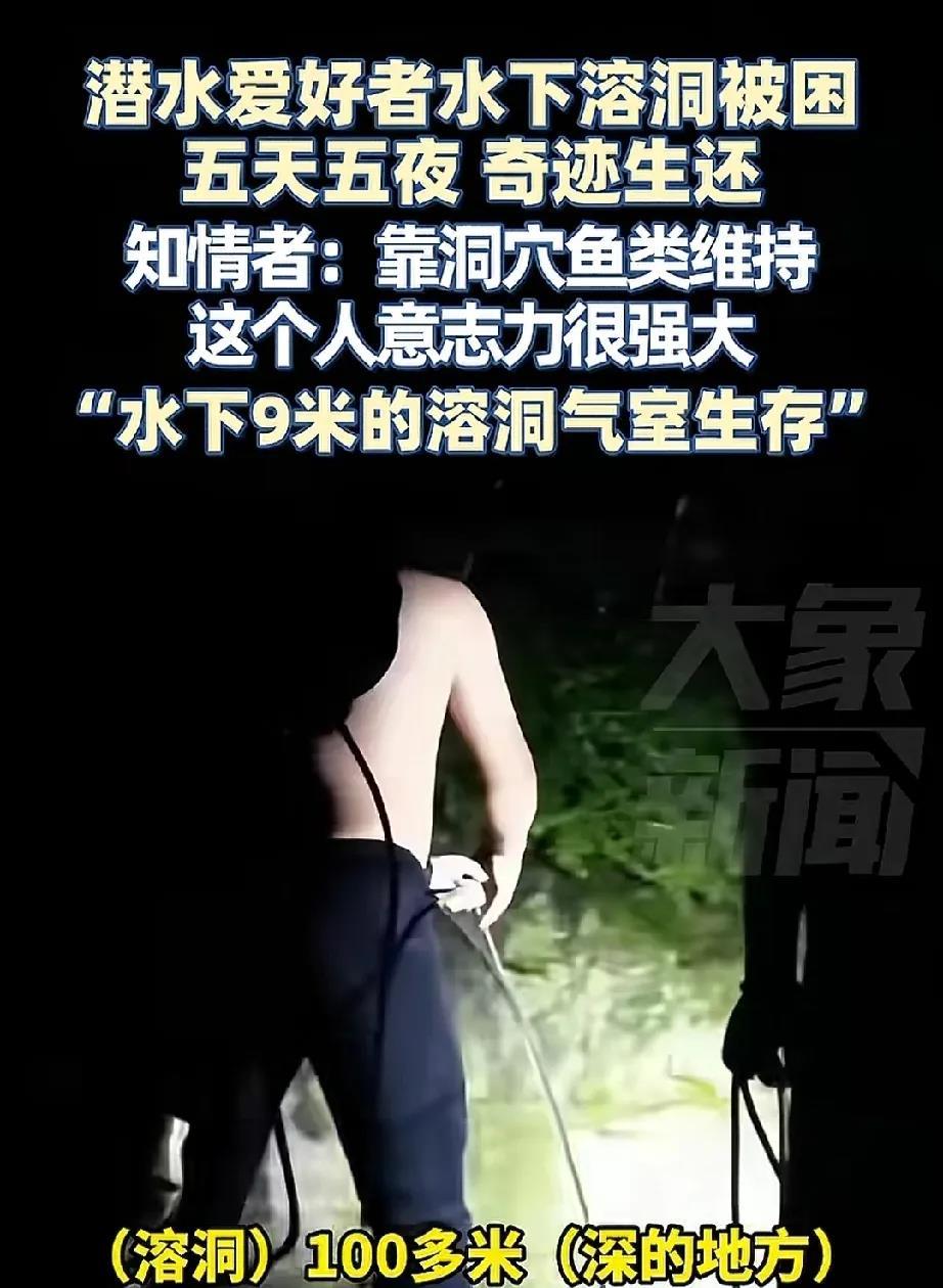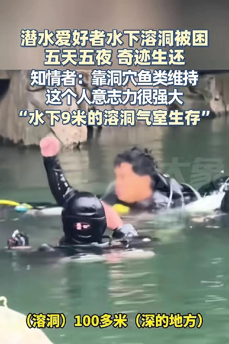 太佩服了!湖南湘西,一男子潜水时被困溶洞,起初他很着急,以为自己要死在这里了,突然他发现溶洞水里有东西在动,走近一看发现水面有不少各种各样的鱼,于是,他靠着这些鱼类撑了5天5夜,最后救援队发现他时,竟然安然无恙,甚至还活蹦乱跳,没有一点像是被困者的样子。网友称他:“野外生存达人” 得知这事的家人,连忙驱车赶到现场,并联系了警方和救援队,他家人说,“活要见人,死要见尸”,最后经过没日没夜的救援,终于在9米溶洞的水下100米找到了他,发现他时整个人精神状态很好,完全不像是被困了五天的样子,就连家人和救援队都表示佩服。 网友说,“大难不死,必有后福,这才是真正的野外生存挑战,建议拍个记录片” 还有人说,“就连潜救援都感觉难度极大,这这件事他能吹一辈子了” “足足130多个小时意志力太强了” 对此你们怎么看?