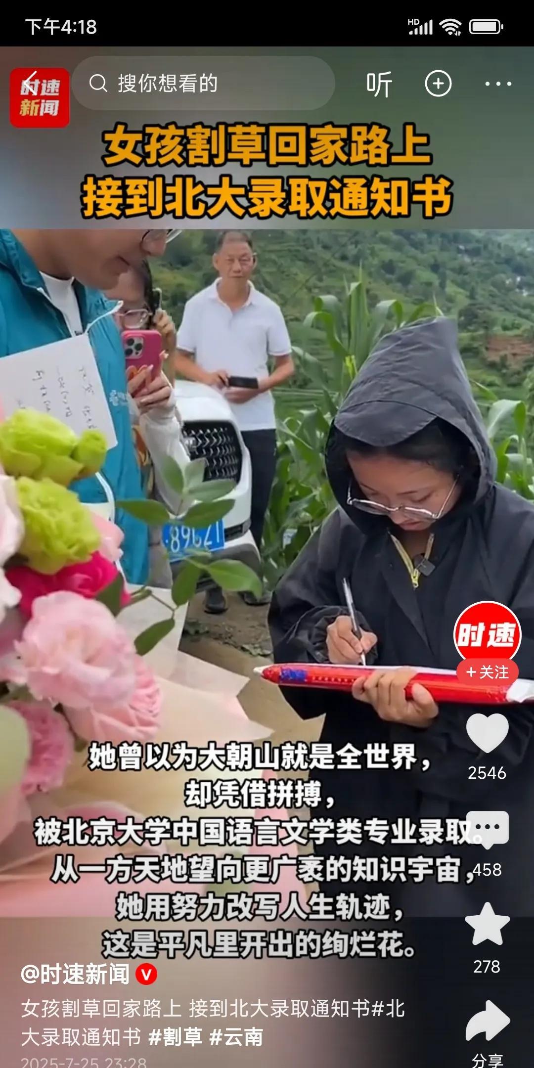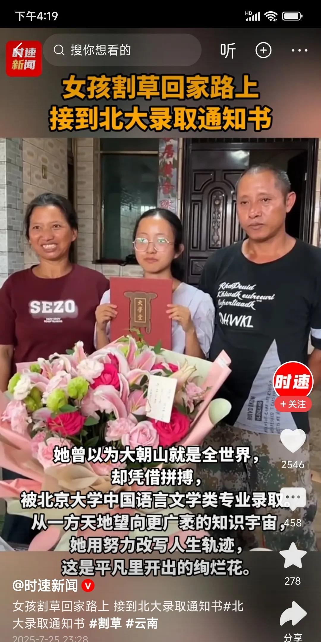 谁说寒门不能出贵子?这两个女孩今年都被北京大学录取了,她们就是来自一穷二白的所谓寒门家庭。 一个是云南临沧女孩张镜,人家是在割牛草回家的路上拿到的通知书,另一个是广西女孩李秋菊,她家最值钱的东西就是斑驳墙上贴满的那些奖状!以前经常有人说现在寒门出不起贵子,现在的顶尖名校已经容不下一些寒门子弟,可这两乡下女孩就让某些人啪啪打脸了。 人家没有上过辅导班,也没有听过名师课堂,她们凭借的就是永不言败的拼搏精神走出大山,实现从丑小鸭到白天鹅的完美逆袭!试问现在还有几个十几岁的青少年会去做家务,有几个人会去干割牛草等农活,大部分都是吹着空调玩着游戏吧?现在物质生活条件比以前好了千万不倍,但孩子们吃苦耐劳的精神却一代不如一代,只有吃的苦中苦方为人上人,勤俭节约吃苦耐劳的传统美德永远不能丢!她俩都被北京大学录取了,是人生最高光的时刻,可是这成功的背后流了多少汗水又有人知道呢?
