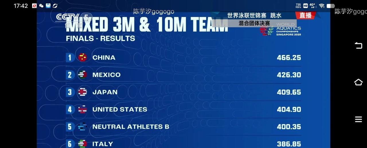 中国跳水队,以466.25获得混合团体冠军。 第一轮,男女单人跳板,中国落后墨西