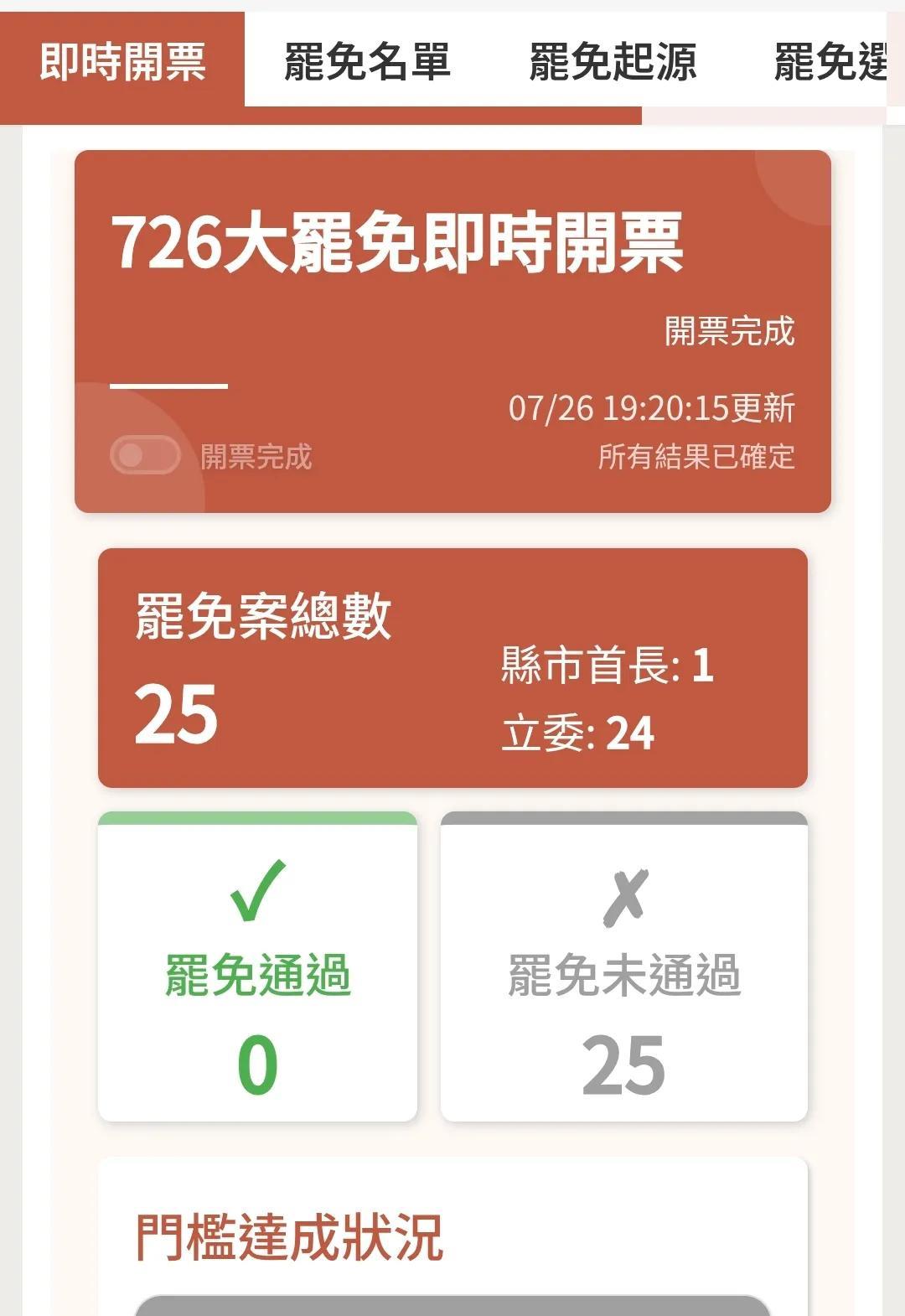 台媒联合报今晚(7月26日晚)报道:“大罢免投票结果出炉,24席蓝委全部过关,通
