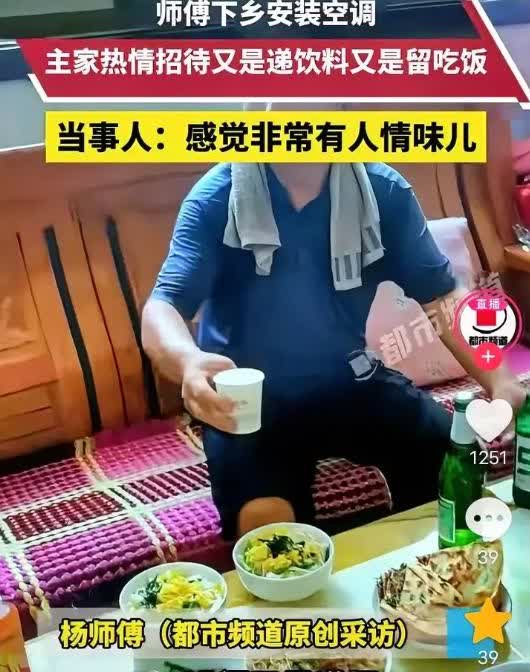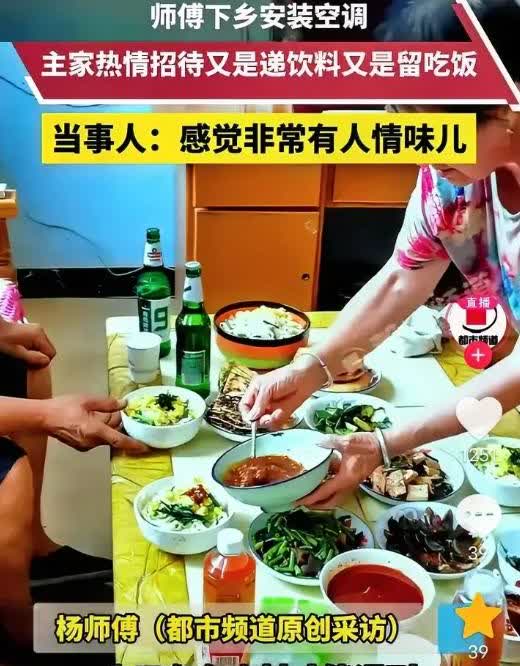 这就是乡下人的实在!陕西咸阳,男子下乡安空调,这一进门可把他整不会了。男主人还没等人坐稳,先塞了根烟,紧接着啤酒、功能饮料一股脑地摆上桌,架势比请亲戚还隆重。小哥埋头干活忙活了大半天,装好调试完毕正准备撤,女主人堵在门口,说在咱农村不吃饭谁都别想走。男主人也不甘示弱,直接一把拉进屋里,先灌一口啤酒再说 小哥推辞两句,人家还真有点急眼了,顺嘴就问是不是嫌自家菜不行。这下小哥彻底没法走,只能乖乖落座 女主人在厨房翻锅,男主人陪着唠嗑,一会儿的工夫,茶几上堆满了菜,什么鸡鸭鱼肉、地里摘的黄瓜西红柿,满满一桌,连饭带菜十几样 吃饭那会儿,男主人一边敬酒,一边说家常,女主人则忙着添饭加菜,两口子轮流上阵,气氛别提多热络了。小哥吃得都有点不好意思了,直说下次还来 临走时,女主人还特地给他装了满满一袋自家水果,连刚拆的烟也塞了几包,说啥都不让空手走。小哥心里是真感慨,城里头再热情的客户,大多也就是倒杯水顶多加个水果点心,很少能有乡下人这样,非得把你当家里人招待一通,真不怕麻烦 说实话,这种场面在农村并不少见。农村人的热情,有时候就是这么直接。他们讲究来者是客,讲人情、重面子,不怕多花点力气,也不怕麻烦自己,只要你进了门,就是自家人 其实,很多在外面跑业务的师傅都有体会,越是农村越有人情味,越让人觉得温暖。哪怕没什么山珍海味,也要让你吃得热乎乎、走得心里舒服,这种情义,是花多少钱都买不来的 现在城里人装修,业主能递瓶矿泉水都算客气。倒不是城里人冷漠,是钢筋水泥把人情都框住了。乡下不一样,谁家灶火冒烟都知道要留客,这种近乎执拗的热情,其实是庄稼人最朴素的价值观:你对我好一分,我就要还你十分