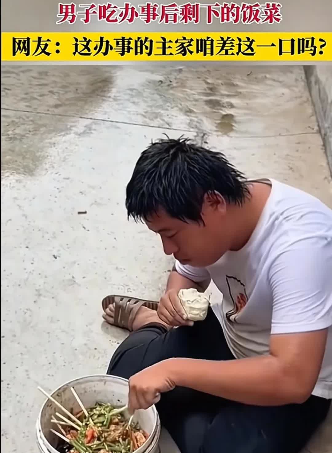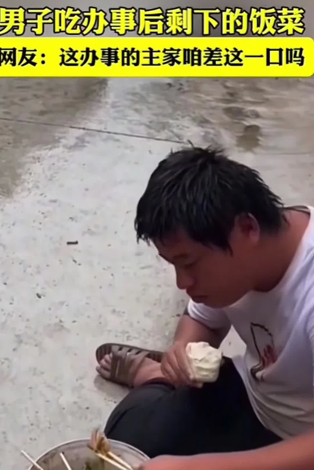 我以过客之名,千言万语一句话,看到这种情况,心情很沉闷。 看到他这么吃真的很难过,心里说不出的滋味,看到这一幕太心酸了,哪怕就算是剩菜只要给他一个碗也行。 其实主人家的客人吃完走了,桌子上的剩菜不收让他坐在那里吃一点也行啊! 看着这男子有可能身体不是正常人,看着他拿筷子手不一样,有哪个正常人会吃这个,唉…… 希望所有人都多一份爱心,都拿善良的心去对得每一个善良的人吧!其实自己过的一地鸡毛,还是会很心疼。
