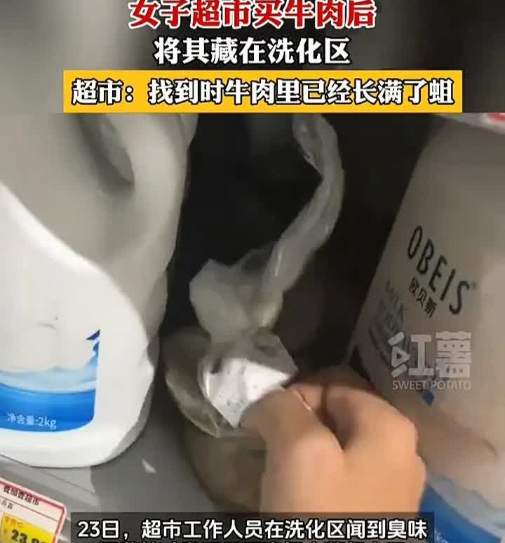 太丢脸了!近日,江西吉安一名女子在超市购物时,故意将称重好的牛肉藏在洗护区货架上