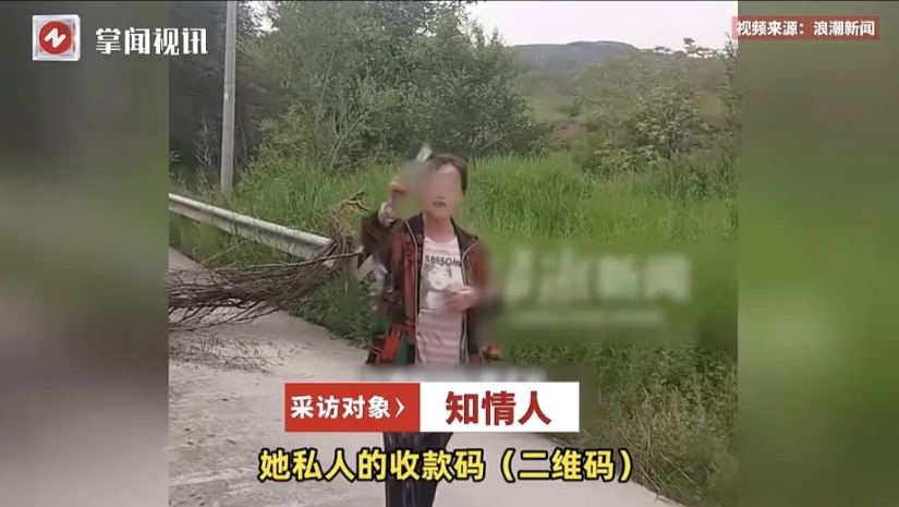视频里,一条山间小路被几根粗树枝横着堵死,一个看上去40来岁的妇女叼着根烟站在路中间,手里举着个二维码牌子,正跟一个过路司机较劲:必须交钱,不给就别想过去!
