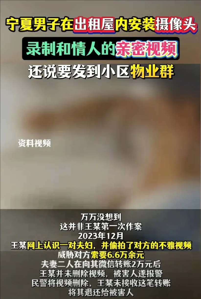 宁夏银川,男子偶然结识女子后,发展成情 人关系,两人多次在出租屋发生关系。期间,男子不讲武德,悄悄在出租屋装了监控,拍下两人亲密的视频。几个月后,女子意识到这样不对,要求结束这段关系,男子不愿意,以隐私视频威胁,索要30000元,不然就将视频发到物业群里。女子知道对方是个无底洞,果断报警,通过调查,男子背后的行为更让人大跌眼镜。