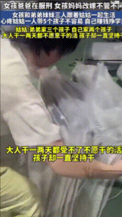 泪目了!一女孩爸爸服 刑,妈妈改嫁,和弟弟妹妹跟姑姑一起生活,女孩心疼姑姑独自带5个孩子,然后自己赚钱挣学费。姑姑:弟弟家三个孩子,自己家两个孩子。大人干一两天都不愿意干的活,侄女却一直坚持干!网友:这姑姑满头白发啊!