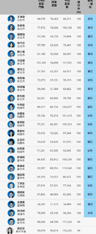 不过,截至北京时间晚上7点,今天被罢免的24位委员+1位市长的投票结果已经基本出炉,不出意外的话,这些人都将以压倒性的优势成功过关。民进党当局遭遇了一场惨败。