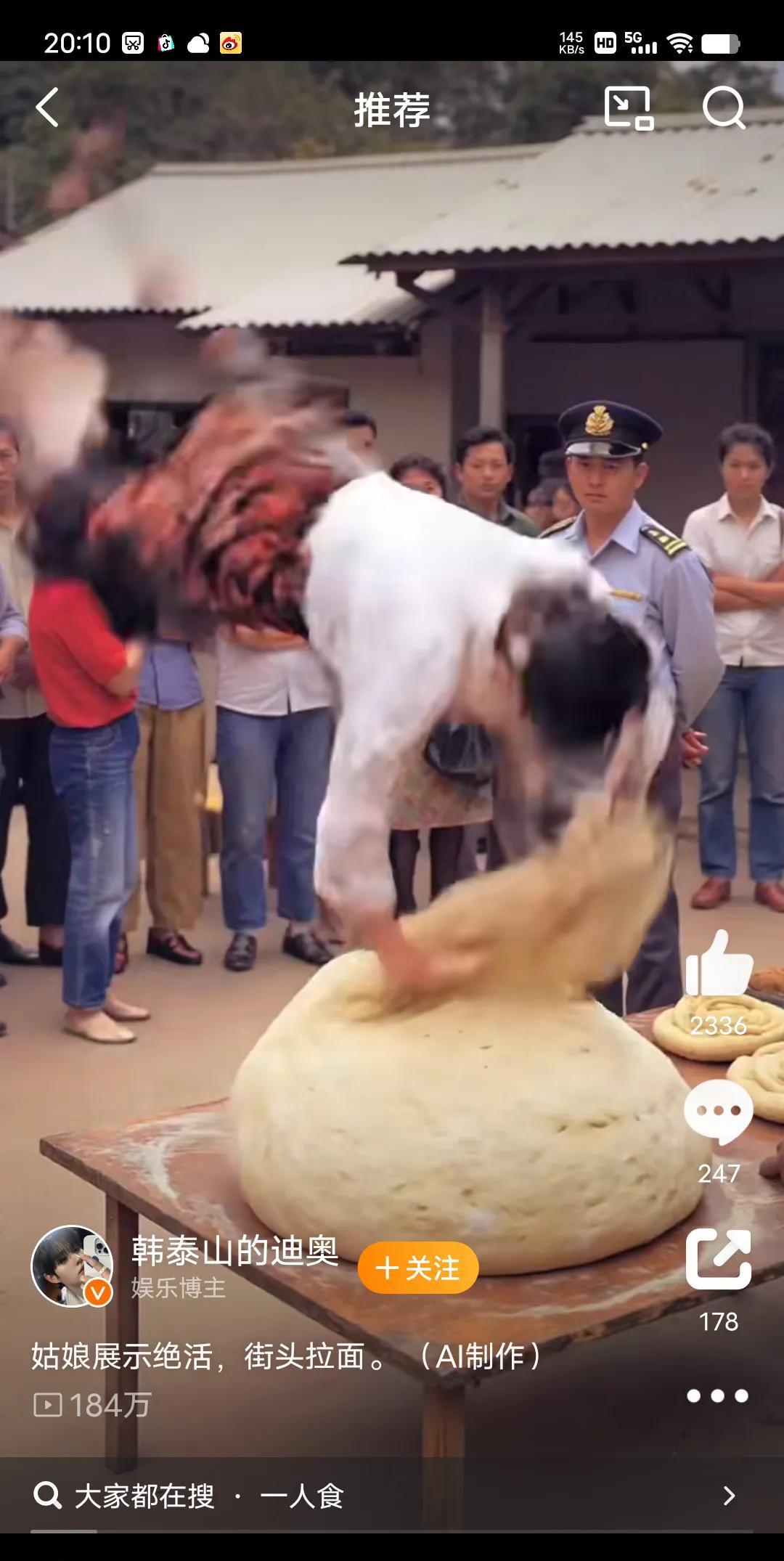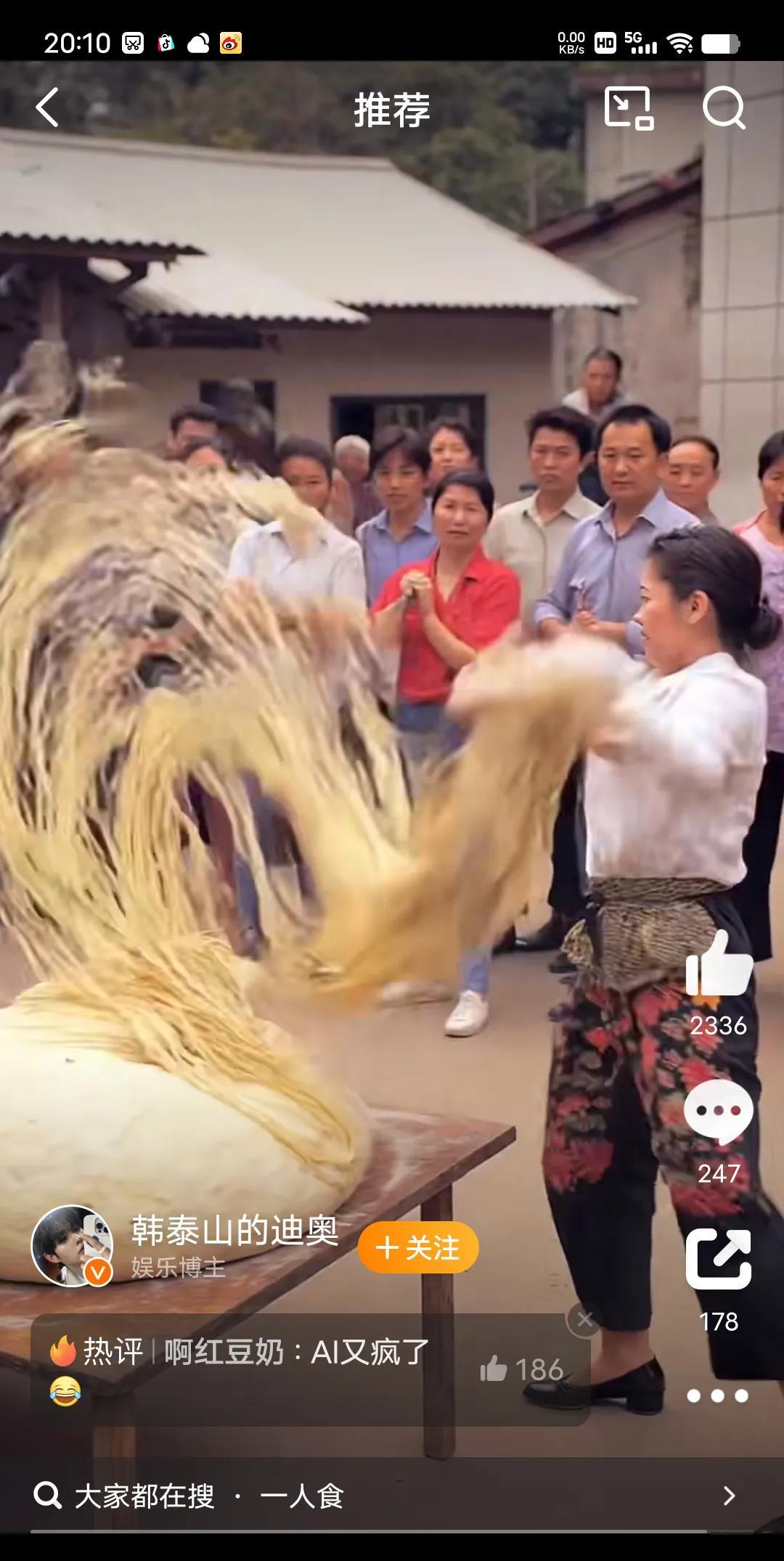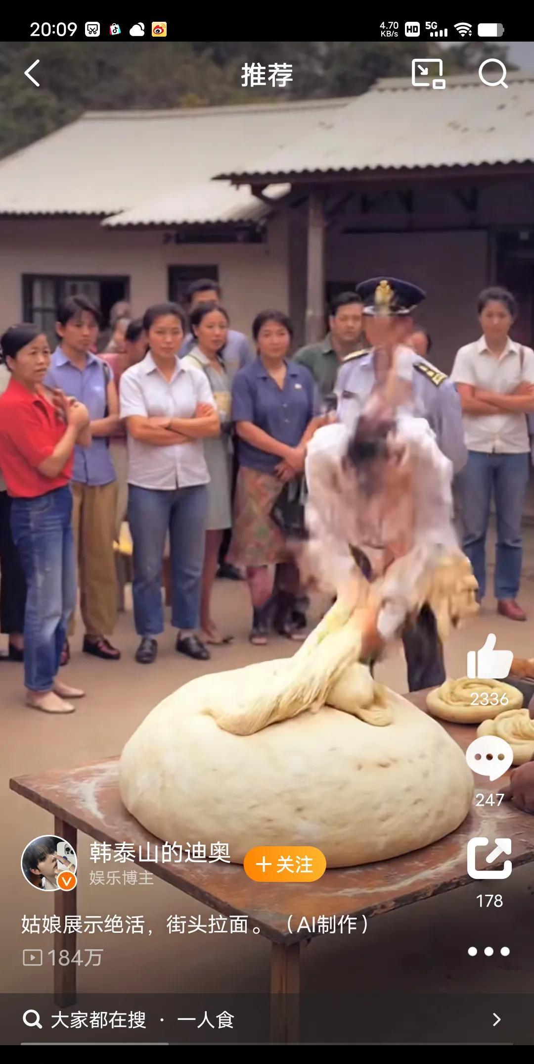 太神了,压面机淘汰了,这样扯面条是真的吗?这一堆面,随手一个动作就变成面条了,能扯这么细吗?面且还翻滚,半空中就把面条扯好了。能有这么高技巧吗?是不是A1合成的呢?A|把人都骗了,人工智能的发展,让人分不清真假了。友友们?你们看这女人扯面是真的吗?