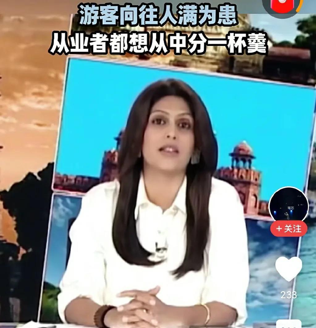 这妹子应该全世界最忙的主持人了,最少也是之一吧。但凡印度有点什么事,她都会第一时间报道出来。而且还有一点,我感觉她说的那些内容真是出自于她个人的注意。 这不,妹子首先给印度即将迎来的旅游高峰设定了一个场景——人满为患。 中国人终于可以到印度旅游了。对于印度人来说这可是个好消息。骄傲的印度人终于可以向中国人展示他们领先上海20年的功力了。终于可以向世界展示什么是真正“梦寐以求”的地方了。 准备去印度旅游的中国人,你们一定要做全面的体验。不仅要体验孟买高级餐厅的手抓美食;还有高种姓的歌舞秀;恒河沐浴游;地道的街边咖喱饭……要不怎么能全面体验印度的文化呢。就冲着【帕尔基·夏尔玛】也该去, 对了,去印度不能带手纸,带手指就行了。