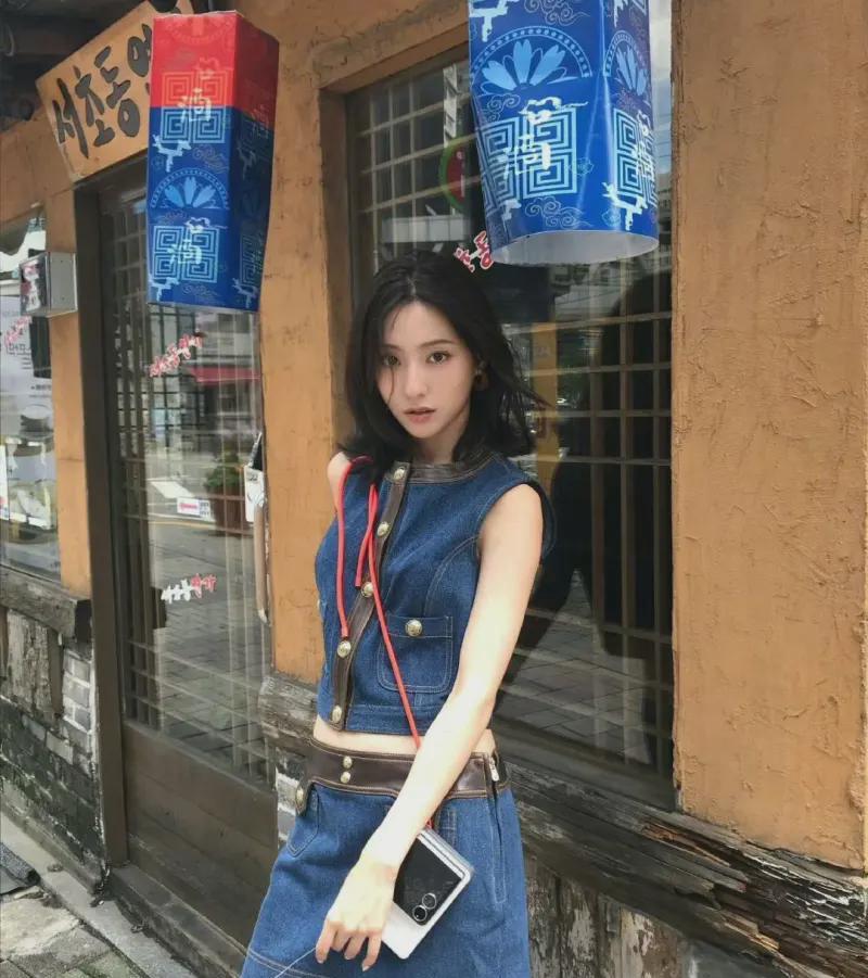 连馨分享晒出最新日常美图大赏,胡连馨身着率性牛仔套装citywalk,用新款随身