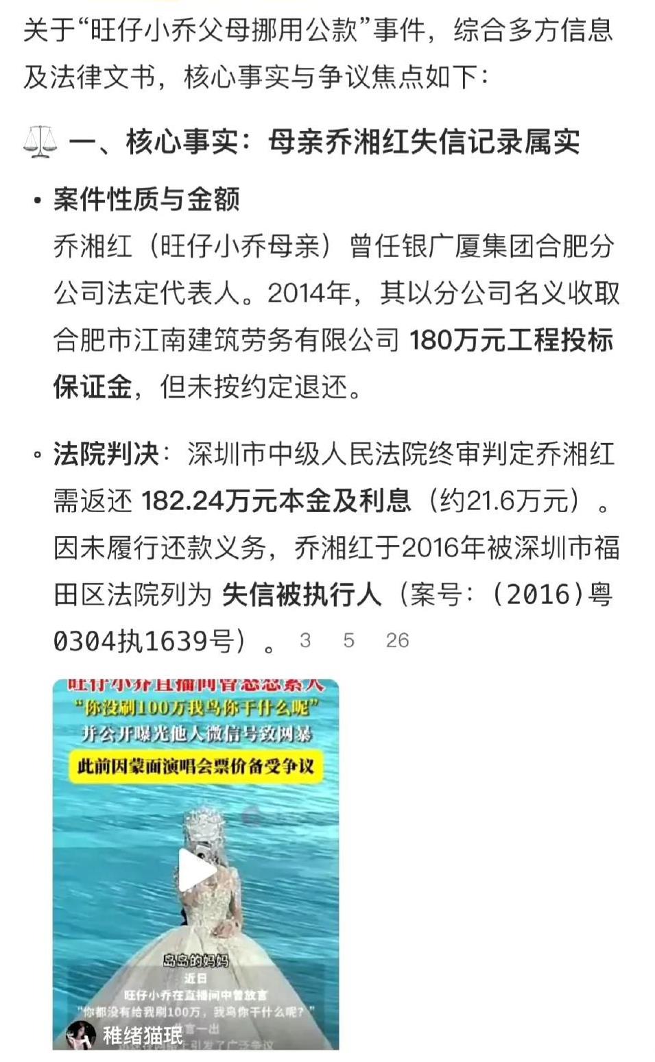 有网友扒出旺仔小乔的照片,不知道是不是真的。而且还显示如果旺仔小乔是(乔馒凝)那他母亲还是失信人。感觉网友很厉害真的扒个底朝天,如果这个旺仔小乔真的是照片上这个女孩子,我只能说长的还算秀气,不是很丑。 而且这次旺仔小乔上海演唱会也取消了。说明作为一个大网红还是要谨言慎行 ,既然想线下开演唱会割韭菜,就不要各种有个性做什么之前好好想一想。