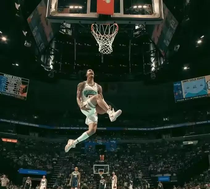最震撼的当属莫兰特的补扣绝杀:比赛最后0.3秒,他腾空1.02秒,以3米93触球高度完成平筐暴扣,直接把掘金主场变成寂静岭!这记绝杀背后是他聘请NASA团队特训的成果,起跳跟腱承受力达12倍体重,简直违背物理定律!