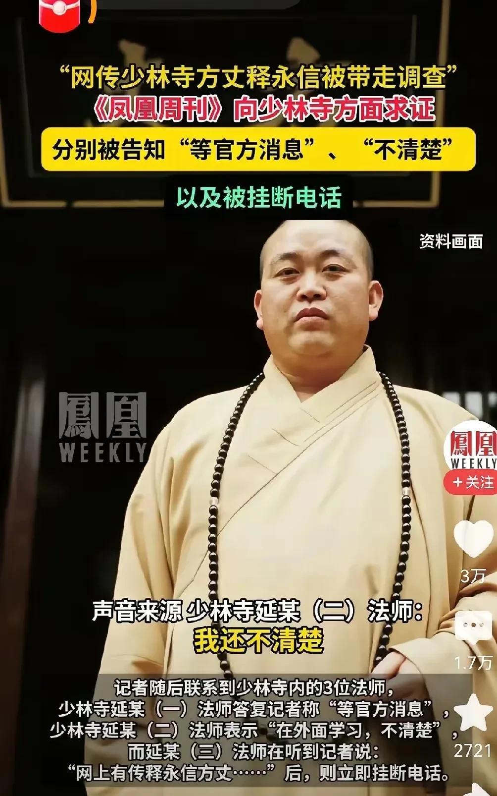 “色即是空,空即是色”,本是禅意之语,用在释永信身上却又多了几分讽刺。7月26日,网传释永信在24日被带走调查。《凤凰周刊》记者多方联系寺里人员,回应要么模糊,要么直接挂电话。以往类似传闻,少林寺都坚决否认,这次却态度暧昧。一位寺内工作人员说等官方消息后挂断,外联老师一听名字就挂。还有学员称刚到寺里没看到方丈。释永信身上争议不断,他本勤奋修行,如今却陷入这般舆论漩涡,这佛门清净地也变得不那么“空”了。
