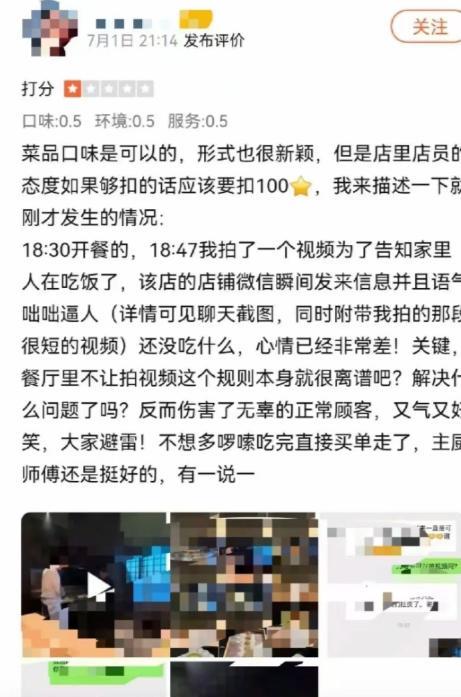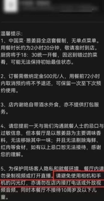 上海,一女子订了家餐厅,一顿饭花3621元,可她竟惹了一肚子气,原来,她吃饭时,随手拍了个厨师烹饪的6秒视频,竟被工作人员一顿训斥:用餐时不能拍视频。女子很生气,质问餐厅,制定了这么多破规矩,为啥不提前告知?餐厅则说:订餐信息里有,你为啥不自己看?女子点开链接,看到餐厅的用餐提醒多达350字,一条比一条离谱,而且她吃饭时,身后站着2个服务员死死盯着她,让她感觉自己被“偷窥”了,她愤怒的给了差评,餐厅的反击惊呆众人。 “花三千多吃顿饭,还跟被监视似的,这到底是来吃饭还是来找罪受!” 李女士(化名)怎么都没想到,自己满心期待的一顿高端餐厅体验,会让自己一肚子火气。 据京报网7月20日报道,李女士早早定了这家特色餐厅,满心欢喜准备享受一顿美食。谁能想到,这餐厅规矩多到让她瞠目结舌。 订餐时,李女士就看到一堆提示,什么全店套餐制还有用餐时长约 2 小时 20 分钟,迟到错过菜肴状态难保证,而且还得交 500 元 / 人的定金,除此之外还有很多条规定。可李女士当时着急订餐,没把这些条条框框当回事,想着不就是吃个饭嘛,哪能那么多事儿。 到了用餐那天,18:30 准时开餐,李女士看着厨师烹饪的场景挺有意思,想记录一下,她就随手拍了个 6 秒的小视频,想发给家里人看看自己在吃啥。结果刚拍完没一会儿,餐厅工作人员就跟盯梢似的,立马过来训斥她,说店里规定用餐时不能拍视频。 李女士一下子懵了,自己只不过拍个视频给家里人看看,怎么就不能拍了?店员却表示,来之前餐厅的规则上就写的明明白白,不让拍视频,李女士十分无奈,而且她压根没注意到这规矩得这么上纲上线,心里顿时火大。 更让她不舒服的是,吃饭的时候,身后还站着 2 个服务员,眼睛死死盯着她,那感觉,就像自己被监视了一样,浑身不自在。 李女士越想越气,她质问餐厅,这么多破规矩,咋不提前好好告知?餐厅倒是理直气壮,说订餐信息里明明白白写着,是她自己不看。 她赶紧去翻链接,好家伙,那用餐提醒密密麻麻 350 字,一条比一条离谱,可谁能想到拍个 6 秒视频能闹这么大动静。这顿饭吃得,菜还没咋品出味来,一肚子气先攒够了。 吃完结账,这一顿饭花了 3621 元,可李女士一点都没觉得值。气不过的她,直接给了餐厅差评,把自己的遭遇一股脑儿全写进去,说菜品口味其实还行,形式也新颖,可店员态度差到能扣 100 分,还吐槽那不让拍视频的规矩离谱,伤害无辜顾客。 这事一曝光,网友们可炸锅了。有人说:“这餐厅规矩也太多了,吃饭跟坐牢似的,花这么多钱还得被管得死死的,图啥呀!” 也有人觉得:“餐厅有自己的经营理念,可也得考虑顾客感受吧,好好说不行吗,上来就训斥,谁受得了!” 后来呢,餐厅面对差评也没回应,还说自家店不接受媒体采访。 对于这件事情,大家有什么看法? 信息来源:新京报