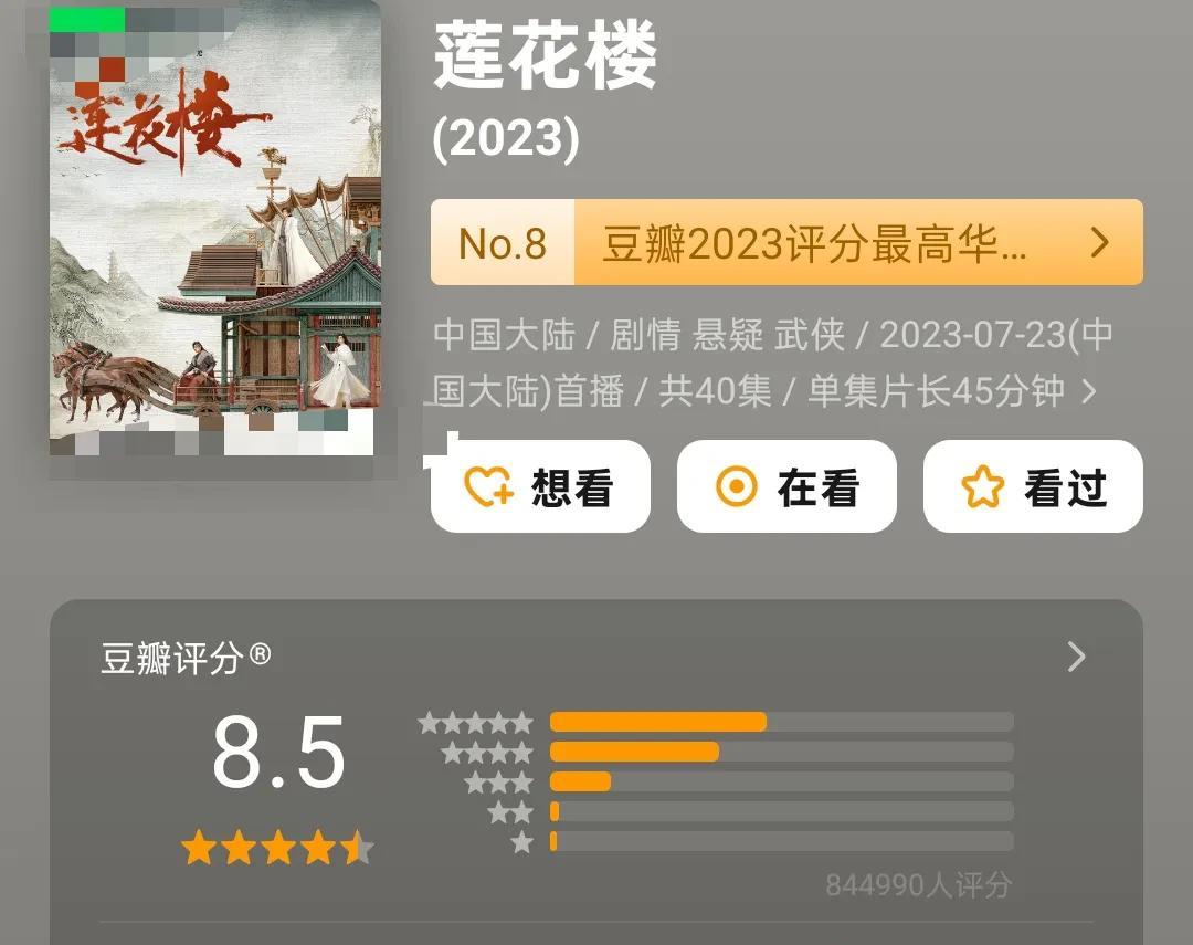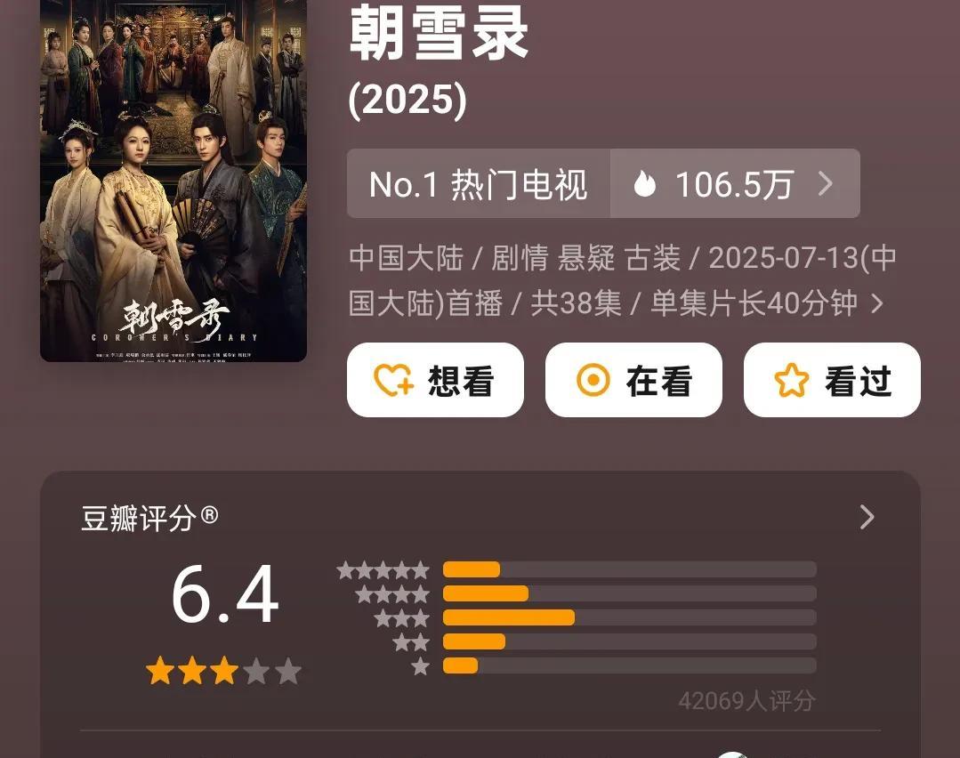 看到一个热搜,说的是《朝雪录》的热度超过了《莲花楼》,也不知道是谁搞得这个热搜,这两部剧我都很喜欢,可这个热搜很显然是在搞对立,悬疑剧和武侠剧怎么能放一起比较热度呢? 从口碑看,《朝雪录》6.4分,《莲花楼》8.5分,而且,《莲花楼》的评价人数远远高于《朝雪录》。我个人其实更喜欢《莲花楼》,无论从故事内容还是演员演技,《莲花楼》是近些年不可多得的纯武侠剧,没有狗血恋情牵绊,也就没有滑向古偶剧。 反观《朝雪录》,这部剧虽然我也喜欢,但它已经从悬疑剧滑向了古偶剧,它不像《唐朝诡事录》那样,把恋情当做点缀,专注破案,反而中后期不断突出恋情,有点喧宾夺主了。 所以说,从故事演技口碑等方面来看,《莲花楼》其实都是远超《朝雪录》的。