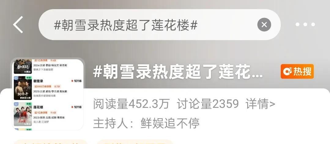 看到一个热搜,说的是《朝雪录》的热度超过了《莲花楼》,也不知道是谁搞得这个热搜,