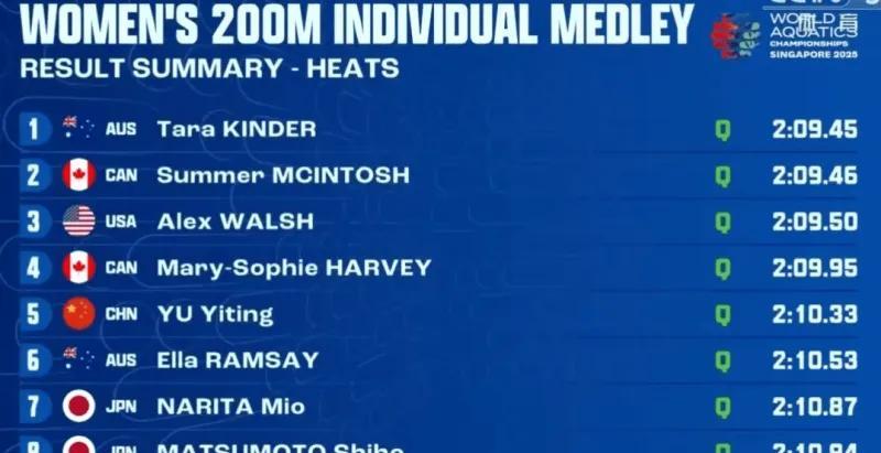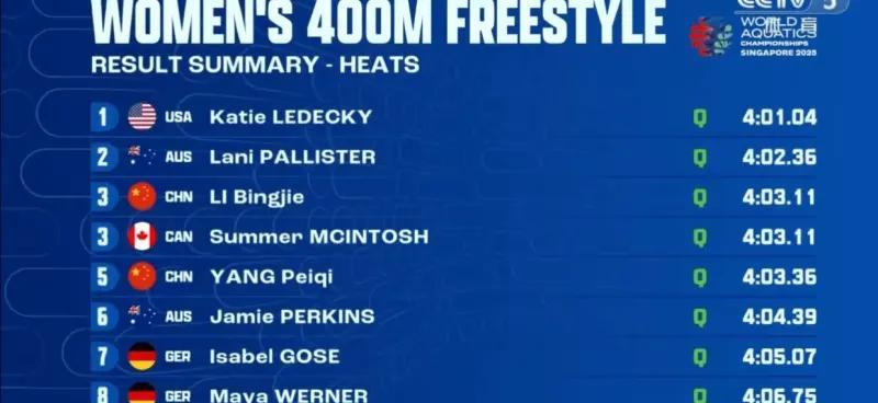 新加坡游泳世锦赛首日预赛:中国队冲金面临巨大压力! 1、男子4x100自接力:中国4位小伙子游出3分12秒26名列预赛第四,进入到今晚决赛。美国3分11秒17预赛第一,澳大利亚3分11秒27第二,意大利3分12秒02排第三。 中国队今晚决赛冲金前景不妙,预赛分段成绩可见一斑:第一棒-陈俊儿 48.56;第二棒王浩宇 47.59;第三棒刘吴狄 48.38;第四棒世界纪录保持者潘展乐 47.73,还没算上反应时,要么状态不佳,要么有所保留准备决赛爆发。 2、女子400米自由泳预赛:李冰洁游出4:03.11排名第三,杨佩琪4:03.36 排名第五,两人发挥正常水平、双双进入今天晚上的决赛。美国名将莱德基以4:01.04排名预赛第一,澳大利亚选手帕利斯特4:02.36排名第二,加拿大选手麦金托什4:03.11与李冰洁并列排名第三。 今晚的决赛,李冰洁冲击一枚奖牌或是合理目标。 3、男子100米蛙泳预赛:覃海洋59秒13排名总成绩第五,董志豪59秒46排名总成绩第七,双双晋级半决赛。俄罗斯选手普里达戈状态不错,以58秒53排名预赛第一,德国选手马策拉第以58秒75排名第二。 本次赛事俄罗斯选手复出参赛,对于覃海洋而言新增劲敌,看看今晚的半决赛成绩再说; 4、女子100米蝶泳预赛:张雨霏游出57秒11,排名总成绩第7,进入半决赛。另外一位中国选手余依婷游出56秒83,排名总成绩第5。世界纪录保持者美国选手格雷琴-沃尔什55秒68遥遥领先、排名预赛总成绩第一,德国选手安吉丽娜-科勒56秒49排名第二。 这个项目中国选手争取先进决赛,而后目标再争取冲击奖牌较为合理。金牌大概率是沃尔什的,好在该项目巴黎奥运金牌胡斯克临时退赛,让中国选手冲击奖牌的希望大增。 5、男子400米自由泳预赛:中国选手张展硕连追五人,最终以3分45秒04个人最佳成绩排名小组第二,总排名第五杀入决赛!费力玮发挥不佳,小组垫底无缘决赛。 今晚决赛,期待张展硕能再创个人最佳成绩即可,奖牌希望不大。 6、女子200米混合泳预赛:余依婷游出2分10秒33排名第二小组第一和总成绩第五晋级半决赛。12岁小将于子迪以2分11秒90,排名小组第六和总成绩第十五,同样闯入到半决赛。澳大利亚选手金德尔2分09秒45排名预赛第一,世界纪录保持者、加拿大选手2分09秒46排名预赛第二。 该项目金牌大概率是麦金托什的,中国选手争取先进决赛而后争取奖牌的目标较为合理。 7、女子4x100米自由泳接力预赛:中国队以总成绩3分35秒63的成绩排名小组第二,总排名第四晋级决赛。分段成绩:程玉洁53.60秒、柳雅欣53.92秒、杨雯文54.20秒,吴卿风53.91秒,此外,美国队以3分33秒57排名第一晋级,澳大利亚队3分34秒64排名第二晋级,荷兰队3分35秒47排名第三晋级。 今晚决赛争取一枚奖牌,是中国队最合理的目标。