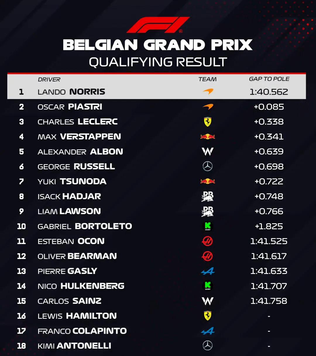 2025F1比利时大奖赛排位赛, 诺里斯拿到杆位不稀奇,反正不是他就是皮亚斯特里,都属于迈凯伦。 法拉利的汉密尔顿,感觉赛季过半了,还是没和赛车产生化学反应。 红牛把霍纳开了,2号车手角田反而快了起来,P7。 梅奔的二号车手安东内利、持续低迷,这次是P18发车。
